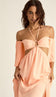 Vestido longo confeccionado em crepe. Possui forro na saia; tecido duplo no busto para não ficar transparente; decote ciganinha; busto aberto com tira comprida embutida no centro para franzir e amarrar no pescoço com ponteiras de metal em formato de conchinha; mangas sino curtas plissadas com elástico nos ombros; lastex franzido nas costas para melhor ajuste ao corpo; busto fixo à saia somente por recorte frontal, deixando toda a região da cintura à mostra; elástico fino na saia e fenda frontal.
