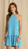 Vestido curto frente única com forro; confeccionado em viscose com toque e aspecto de linho e leve elasticidade. Possui decote halter com tirinha fixa para amarrar no pescoço, ponteiras de metal, elástico interno nas cavas e nas costas para melhor ajuste ao corpo, modelagem soltinha com recortes que modelam a silhueta, babado da saia com detalhe franzidinho e fechamento traseiro por zíper invisível.
