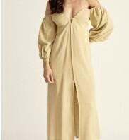 Vestido longuete confeccionado em linho com forro. Possui decote princesa com silicone interno no busto para maior segurança, alcinhas reguláveis, mangas 3/4 bufantes com lastex no punho e elástico franzido no ombro, deixando-os à mostra; modelagem mais ajustada na cintura e aberta na saia; recorte e detalhe em vivo abaixo do busto e no comprimento; lastex franzido nas costas e fenda frontal.