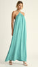 Vestido longo com forro; confeccionado em crepe texturizado mais encorpadinho com aspecto de linho. Possui modelagem ampla, decote halter estilo frente única com detalhe frontal de franzidinhos no decote, tiras fininhas compridas com ponteiras de metal na gola para amarrar no pescoço e tira embutida nas costas para ajuste da altura do decote e amarração.