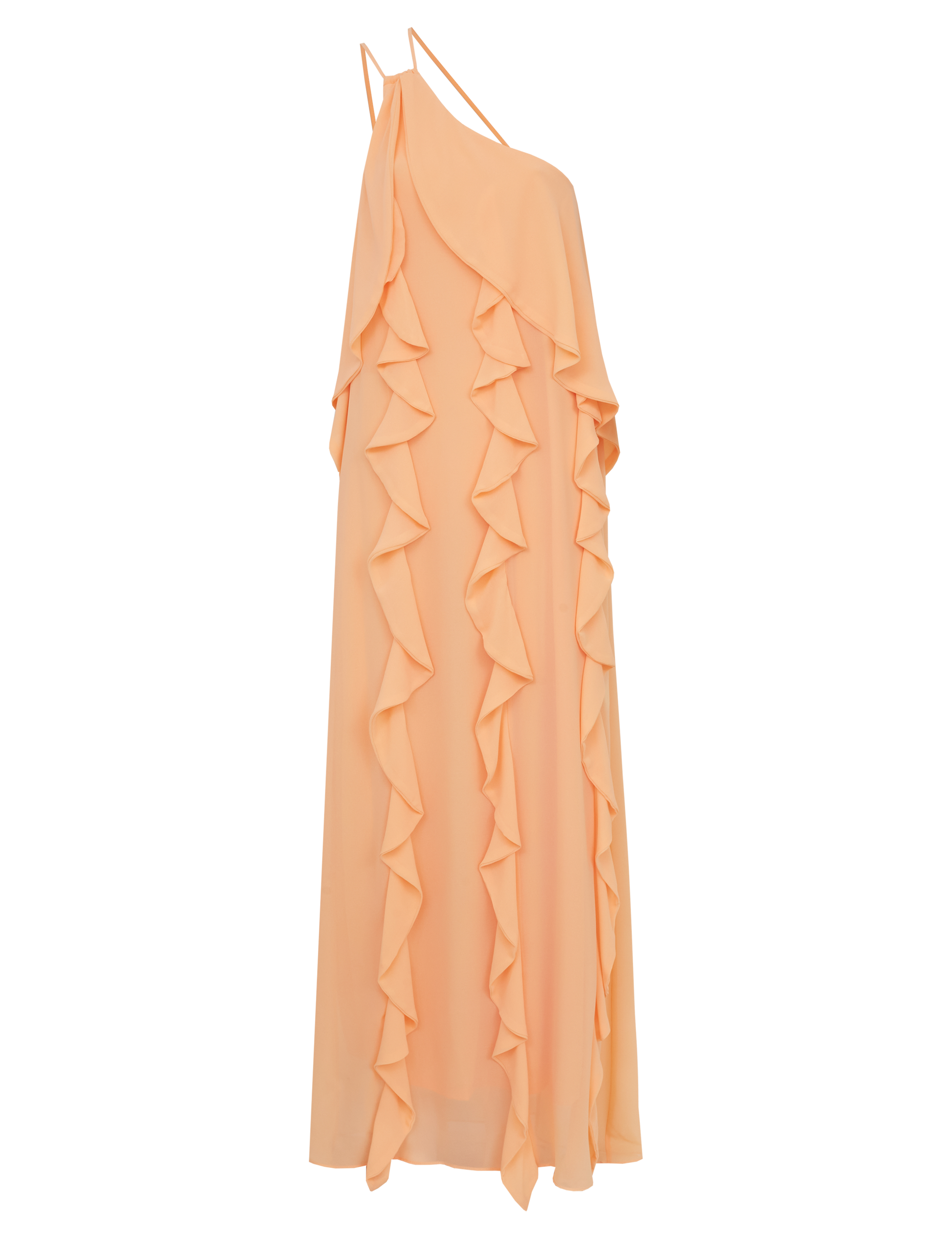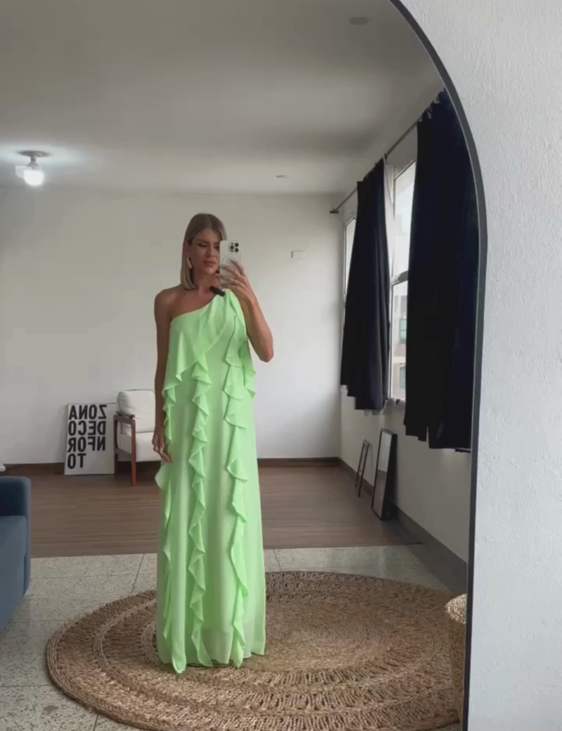 Vestido longo confeccionado em crepe leve com forro. Possui modelagem soltinha, decote ombro único com elástico fino interno para melhor ajuste ao corpo e tirinha comprida para amarração do ombro até as costas, camadas de babados frontais no decote e em fileiras verticais em cascata.