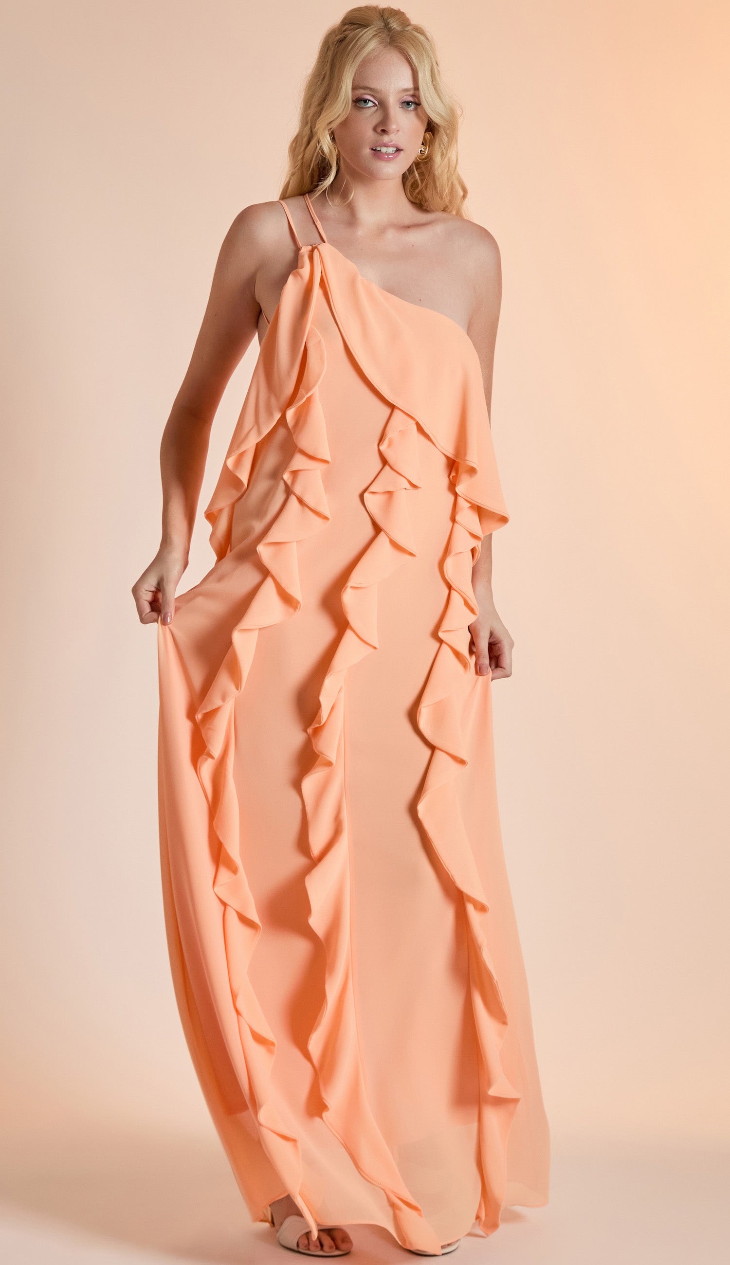 Vestido longo confeccionado em crepe leve com forro. Possui modelagem soltinha, decote ombro único com elástico fino interno para melhor ajuste ao corpo e tirinha comprida para amarração do ombro até as costas, camadas de babados frontais no decote e em fileiras verticais em cascata.