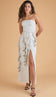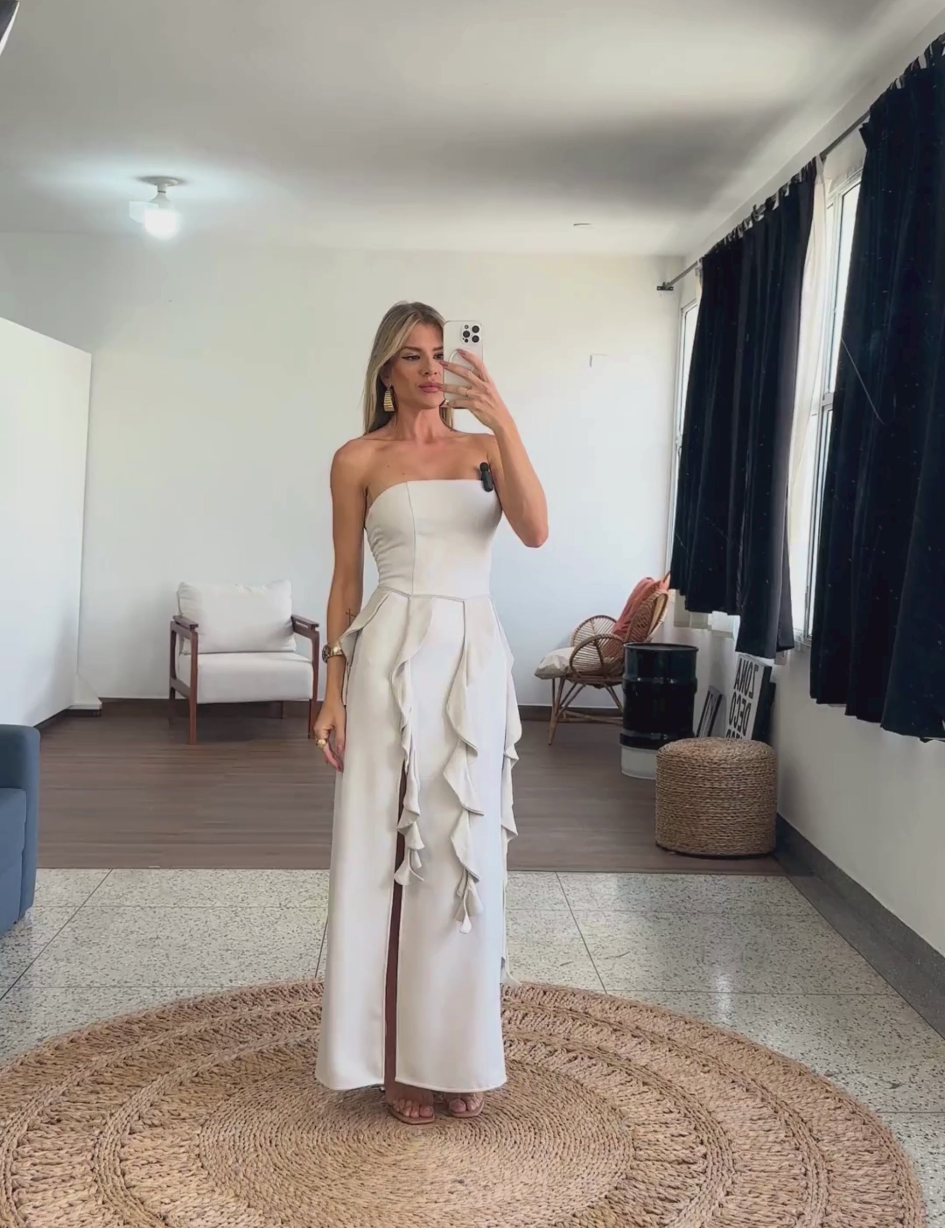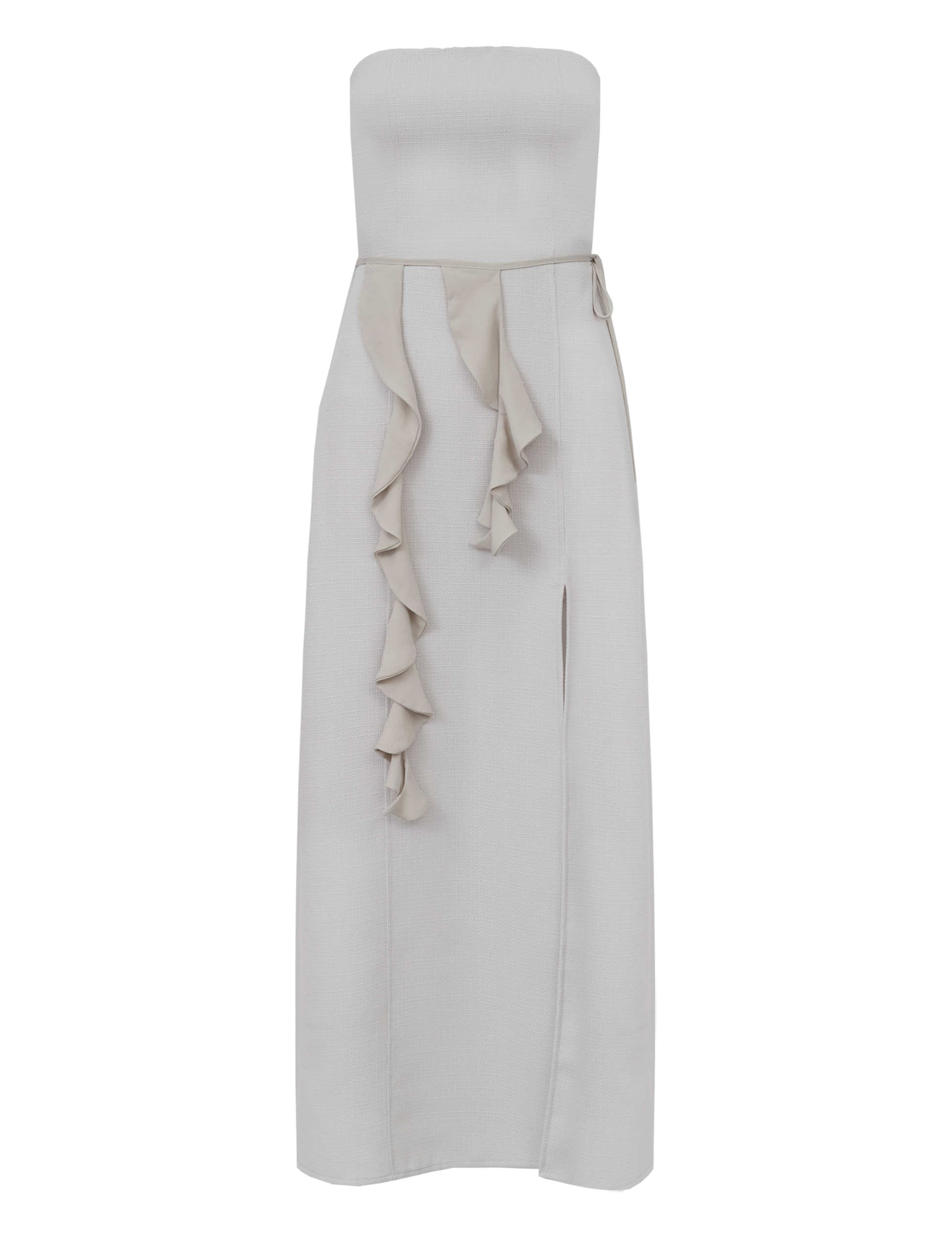 Vestido longo sem mangas confeccionado em tweed encorpado com forro. Possui decote reto com silicone elástico interno para maior segurança, recortes frontais que modelam e estruturam a peça, modelagem ajustada, lastex franzido nas costas para maior conforto, fenda frontal e fechamento traseiro por zíper de metal com pingente que tem a conchinha da Laguna gravada. Acompanha cinto em crepe para amarrar na cintura, com aplicação de babados verticais em cascata.