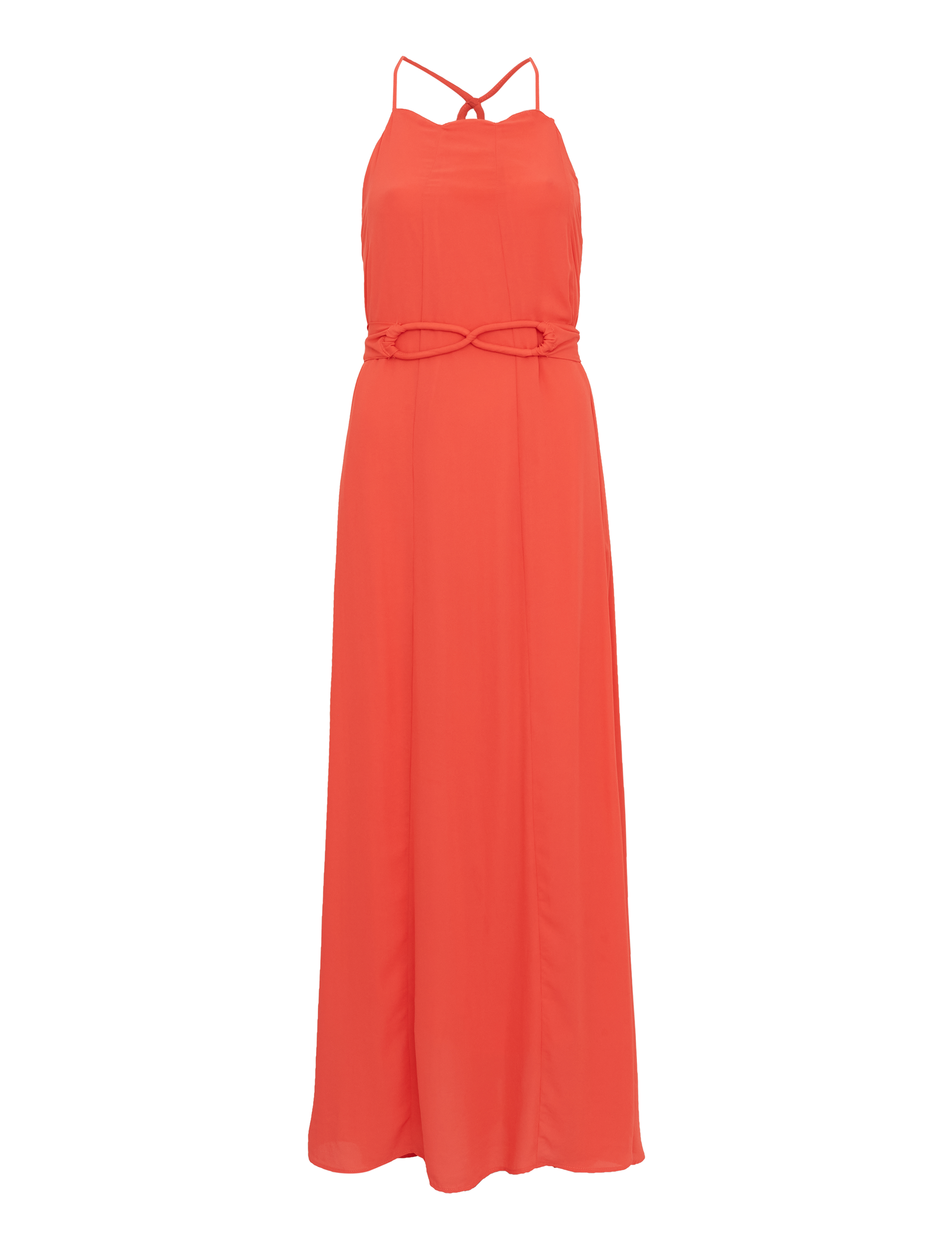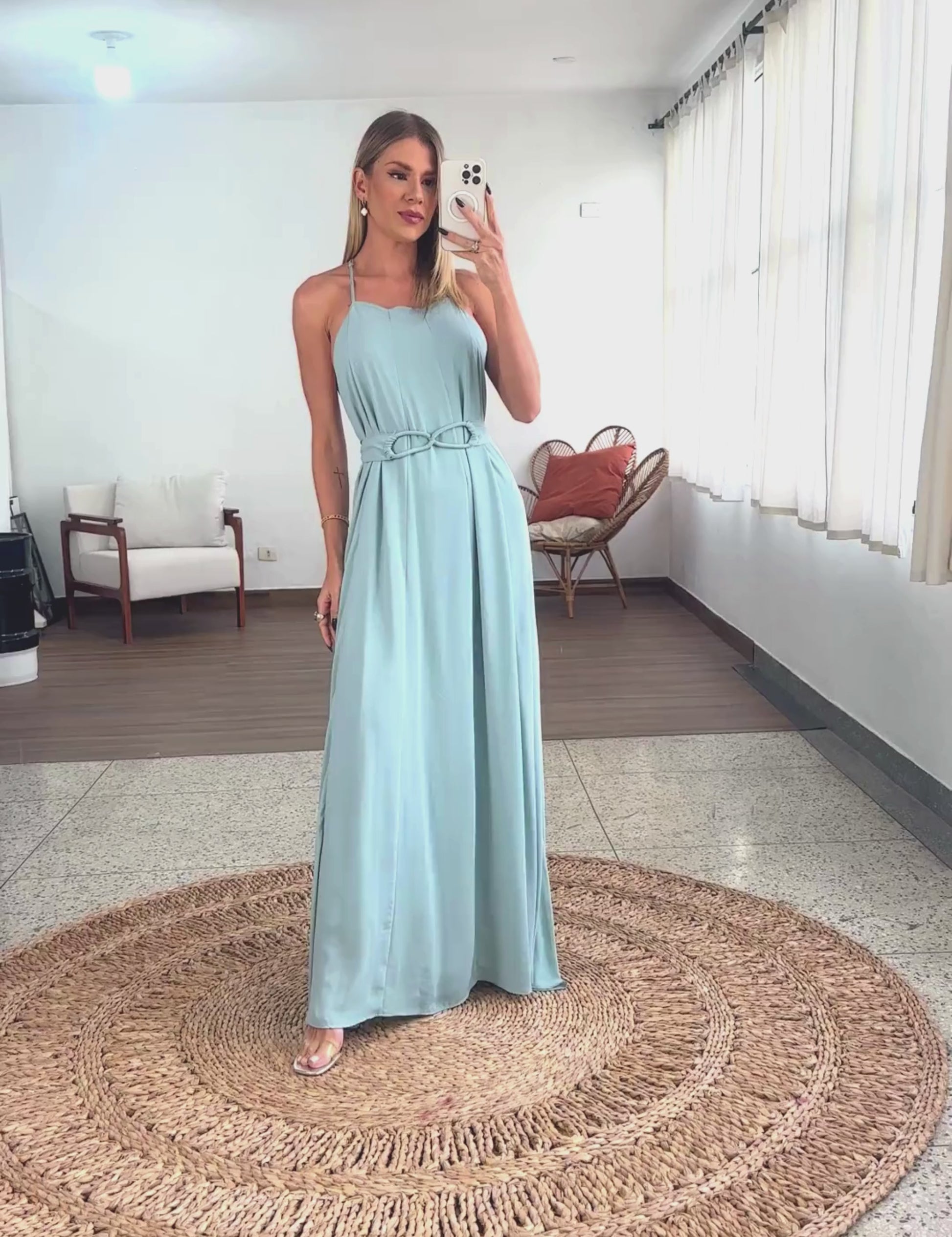 Vestido longo confeccionado em crepe com forro. Possui modelagem ampla frente única, decote halter com recortes geométricos arredondados, nesgas, alcinhas reguláveis com detalhe de cordões forrados entrelaçados nas costas, criando um lindo decote e acompanha faixa solta para amarrar na cintura com o mesmo detalhe de cordões forrados entrelaçados.