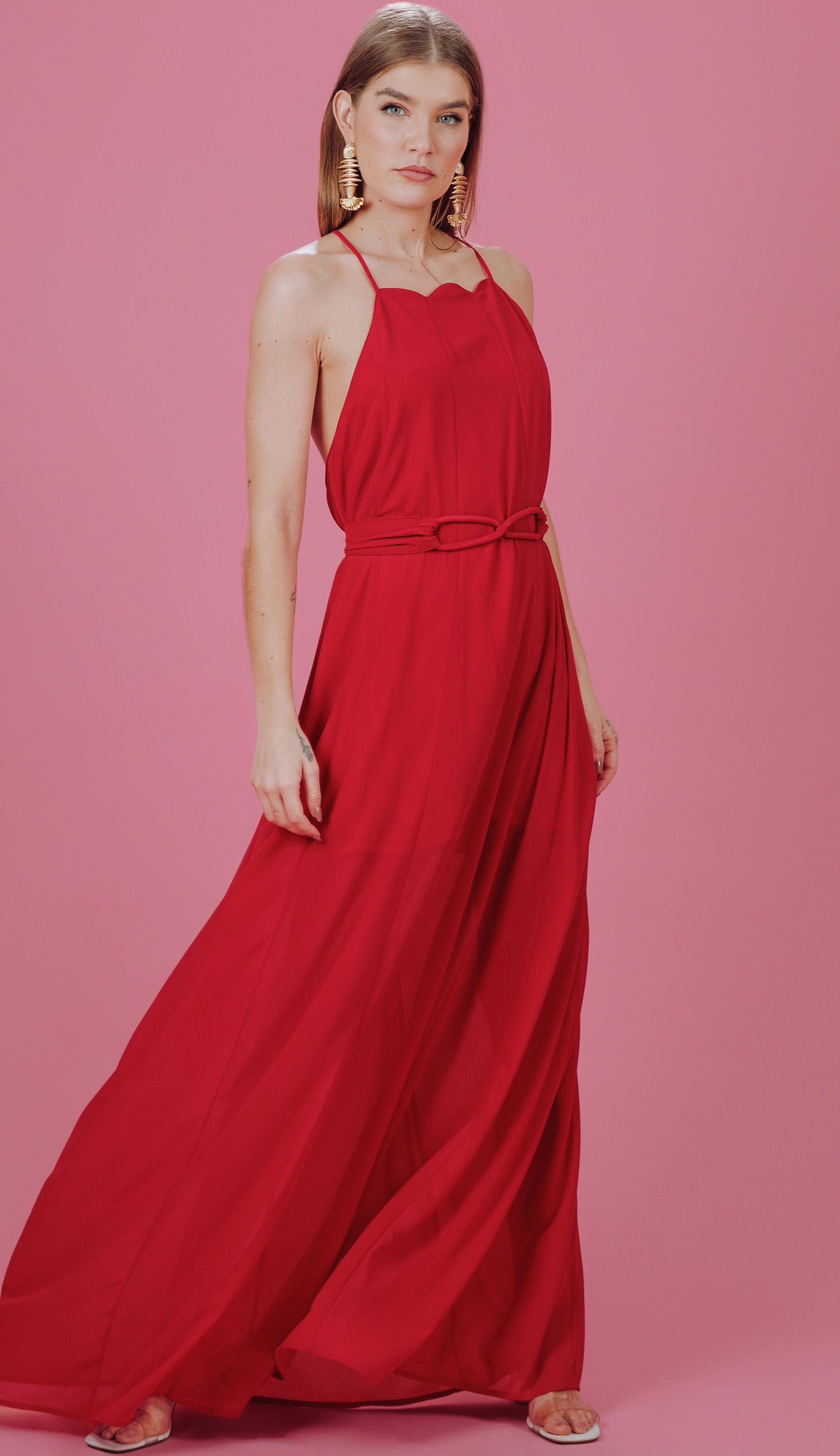 Vestido longo confeccionado em crepe com forro. Possui modelagem ampla frente única, decote halter com recortes geométricos arredondados, nesgas, alcinhas reguláveis com detalhe de cordões forrados entrelaçados nas costas, criando um lindo decote e acompanha faixa solta para amarrar na cintura com o mesmo detalhe de cordões forrados entrelaçados.