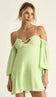 Vestido curto com forro, confeccionado em poliviscose texturizada com aspecto de linho e efeito amassadinho. Possui decote coração com detalhe de cordão forrado no centro do busto com recortes vazados, de onde saem tirinhas para amarrar; alcinhas reguláveis; mangas bufantes no estilo ciganinha com punho em lastex; recortes frontais que dão movimento à peça; lastex nas costas para maior conforto e fechamento traseiro por zíper de metal com a conchinha da Laguna gravada.