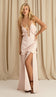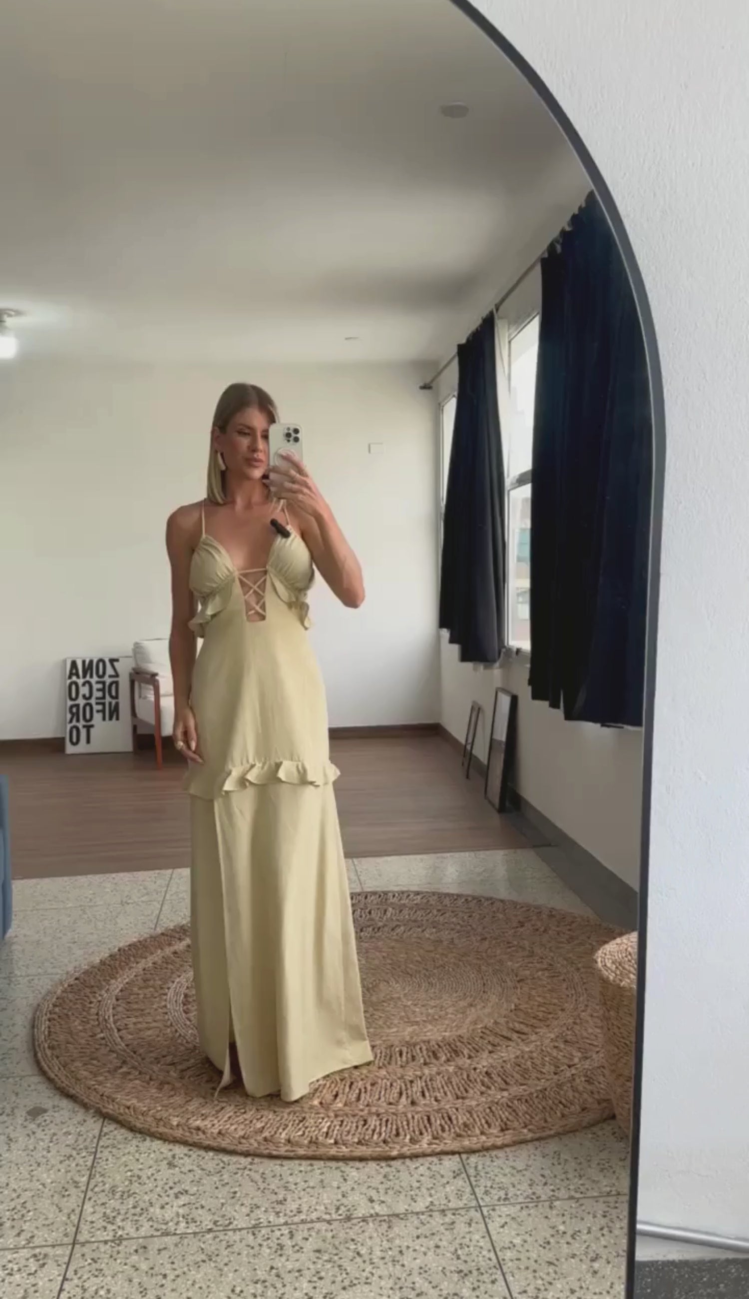 Vestido longo confeccionado em linho com forro na saia. Possui tecido duplo no busto para não ficar transparente; decote aberto com alcinhas reguláveis embutidas cruzadas, que vão até as costas; abertura no centro até a altura da cintura com detalhe de tirinhas fixas cruzadas; franzidinho abaixo do busto com aplicação de babados; elástico fino franzido nas costas; recorte na saia com aplicação de babados e fenda frontal.
