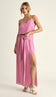 Vestido longo confeccionado em crepe com forro. Possui decote princesa na frente e degagê nas costas; alcinhas reguláveis; elástico franzido interno na cintura com tecido soltinho no corpo da peça, dando um efeito blusê; faixa larga fixa na cintura para amarrar, com franzidinhos que criam um efeito drapeado na faixa e fenda frontal na saia.