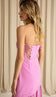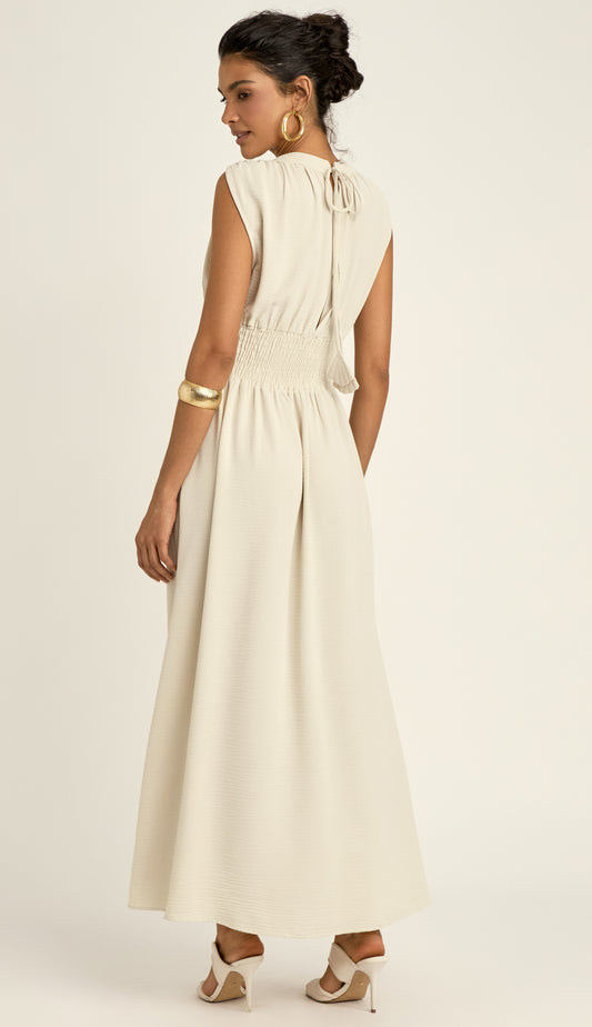 Vestido longo sem mangas confeccionado em crepe com forro grosso. Possui decote reto com silicone elástico interno para dar mais sustentação, recortes no busto e na cintura que modelam a silhueta e mantêm a peça ajustada em todo o corpo até a região do quadril, onde conta com um recorte assimétrico e pala, de onde abre a saia mais soltinha e franzidinha a partir daí; nas costas possui recortes vazados nas duas laterais com tirinhas transpassadas para amarração e fechamento traseiro por zíper invisível.