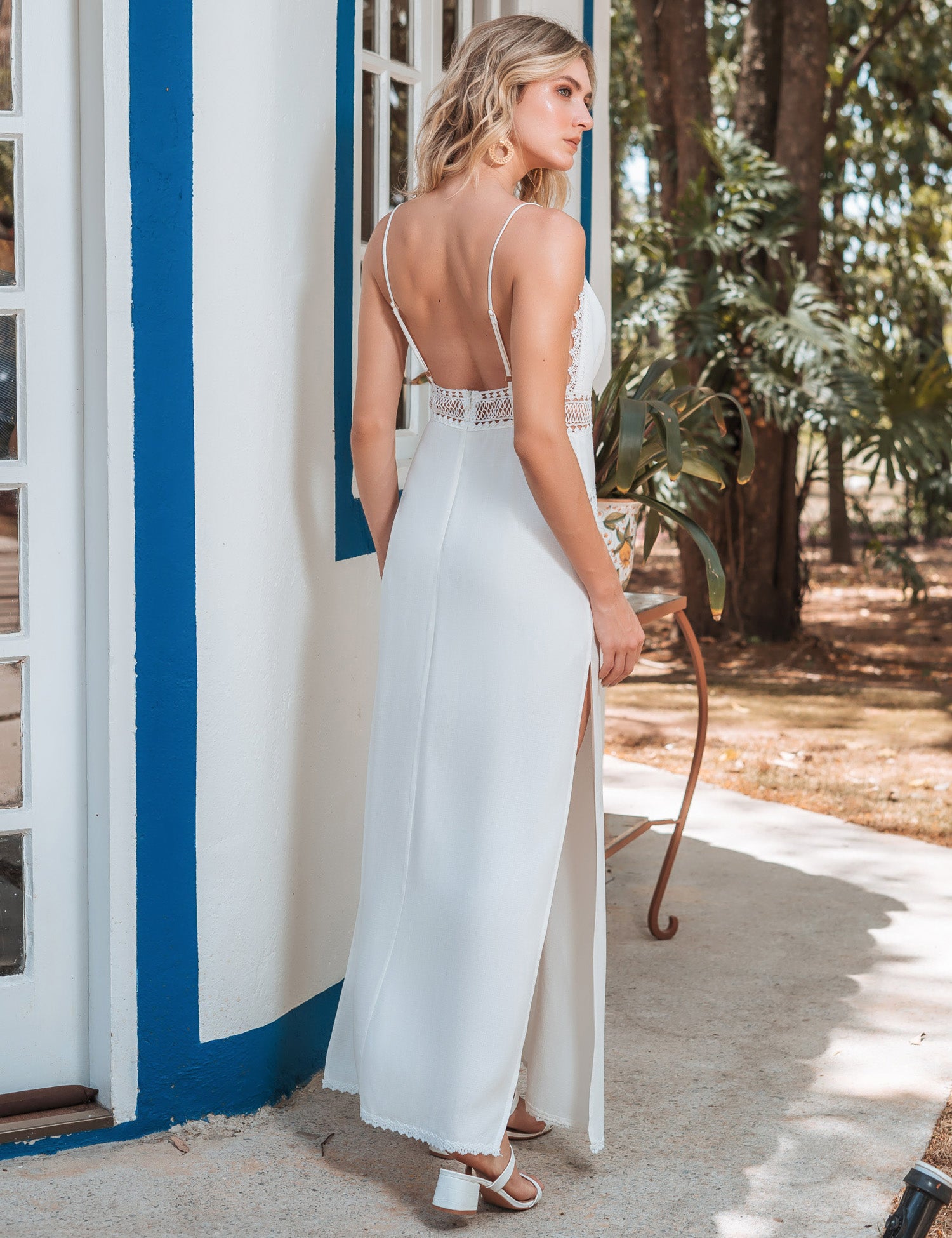 Vestido longuete confeccionado em viscose. Delicado e fresquinho, ideal para ser usado de dia ou como saída de praia. Shape acinturado de modelagem mais soltinha, decote em V, alças reguláveis, busto com recortes estruturados, rendinhas embutidas por todo o decote e barra da saia, renda entremeio em detalhe na cintura e quadril, fendas laterais, forro embutido e fecho posterior por zíper invisível.