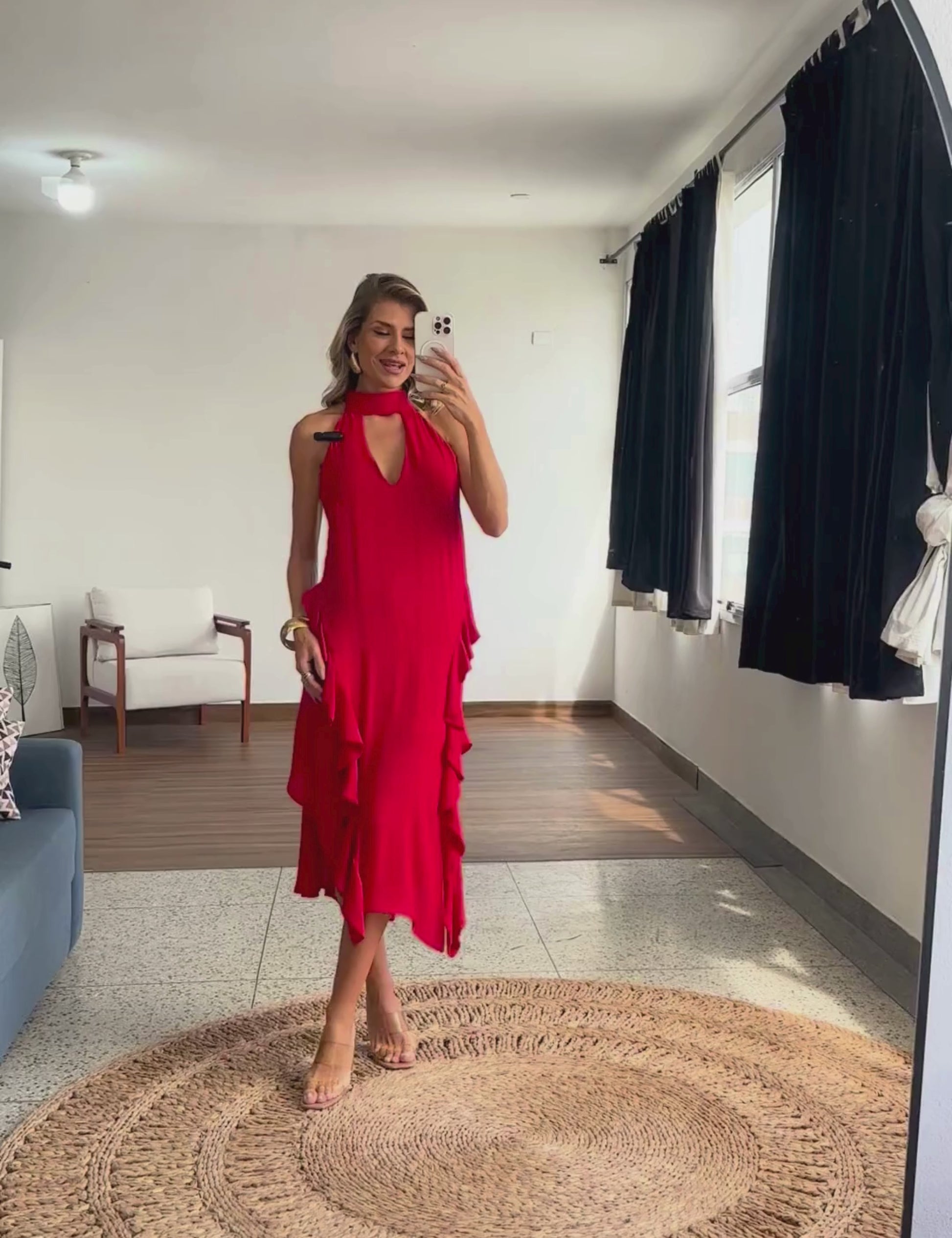 Vestido longuete em crepe leve com forro. Possui modelagem frente única; decote halter com gola alta, recorte frontal vazado em V e cava americana profunda; fechamento na nuca por botão esmaltado; modelagem reta com babados em cascata na frente; fechamento lateral por zíper invisível; costas nuas e saia assimétrica com fendas laterais.