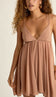 Vestido curto confeccionado em crepe leve texturizado com forro. Possui decote em V, alcinhas duplas compridas para ajuste e amarração cruzadas nas costas, modelagem império com elástico interno logo abaixo do busto e saia bem ampla e fluida.