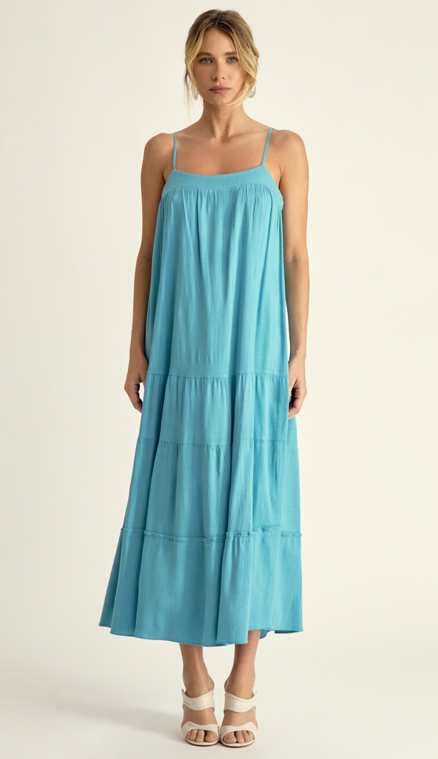 Vestido midi com forro confeccionado em viscose com toque e aspecto de linho e leve elasticidade. A peça é ampla com recortes, franzido, decote reto com pala e alças finas reguláveis. O vestido Camila é bem leve e soltinho! Uma ótima opção para combinar com jaquetas de couro ou jeans.