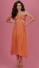 Vestido midi com forro confeccionado em viscose. A modelagem é frente única com a parte busto solta para amarração nas costas. Decote arredondado com argola, cordão para amarrar, elástico para melhor ajuste, detalhe de renda e abertura. A saia possui elástico na cintura, aplicação frontal de renda e fendas laterais.