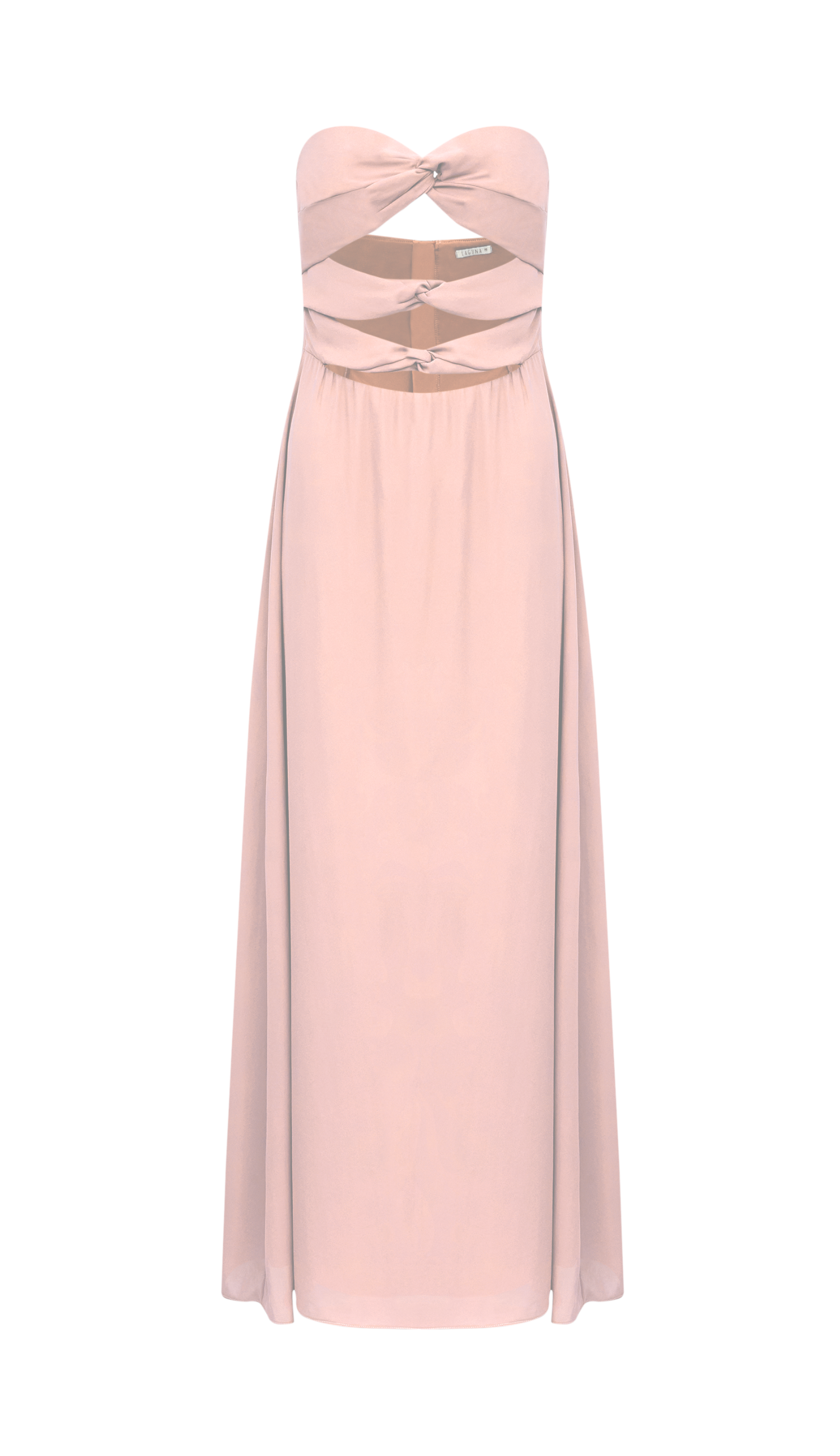 Vestido longo sem mangas confeccionado em crepe leve com forro na saia. Possui tecido duplo no busto para não ficar transparente; decote coração com nó no centro e silicone interno para maior segurança; recortes vazados frontais, abaixo do busto e na cintura, com detalhe também de nós; elástico interno na parte da frente da cintura e fechamento traseiro por zíper de metal com pingente que tem a conchinha da Laguna gravada.