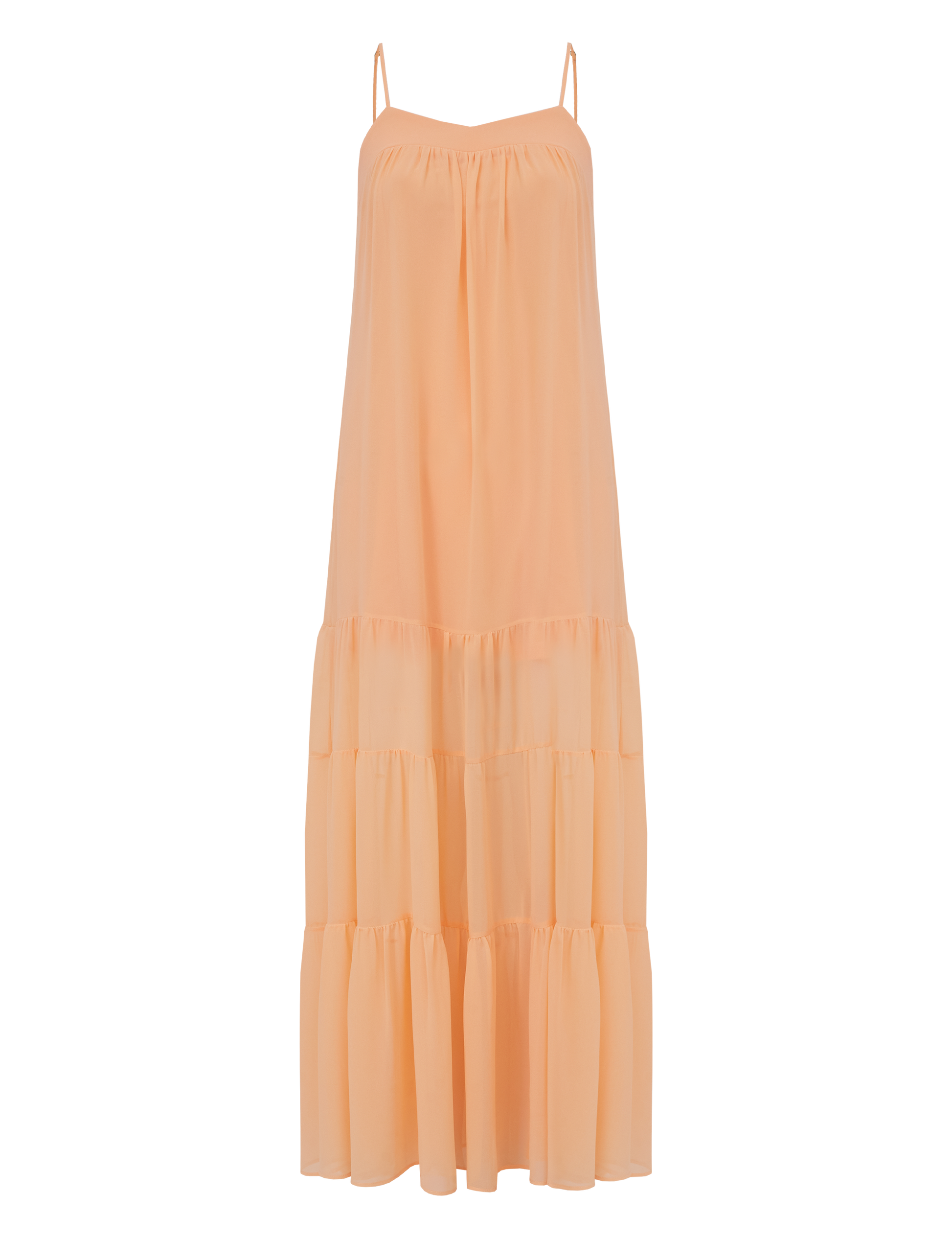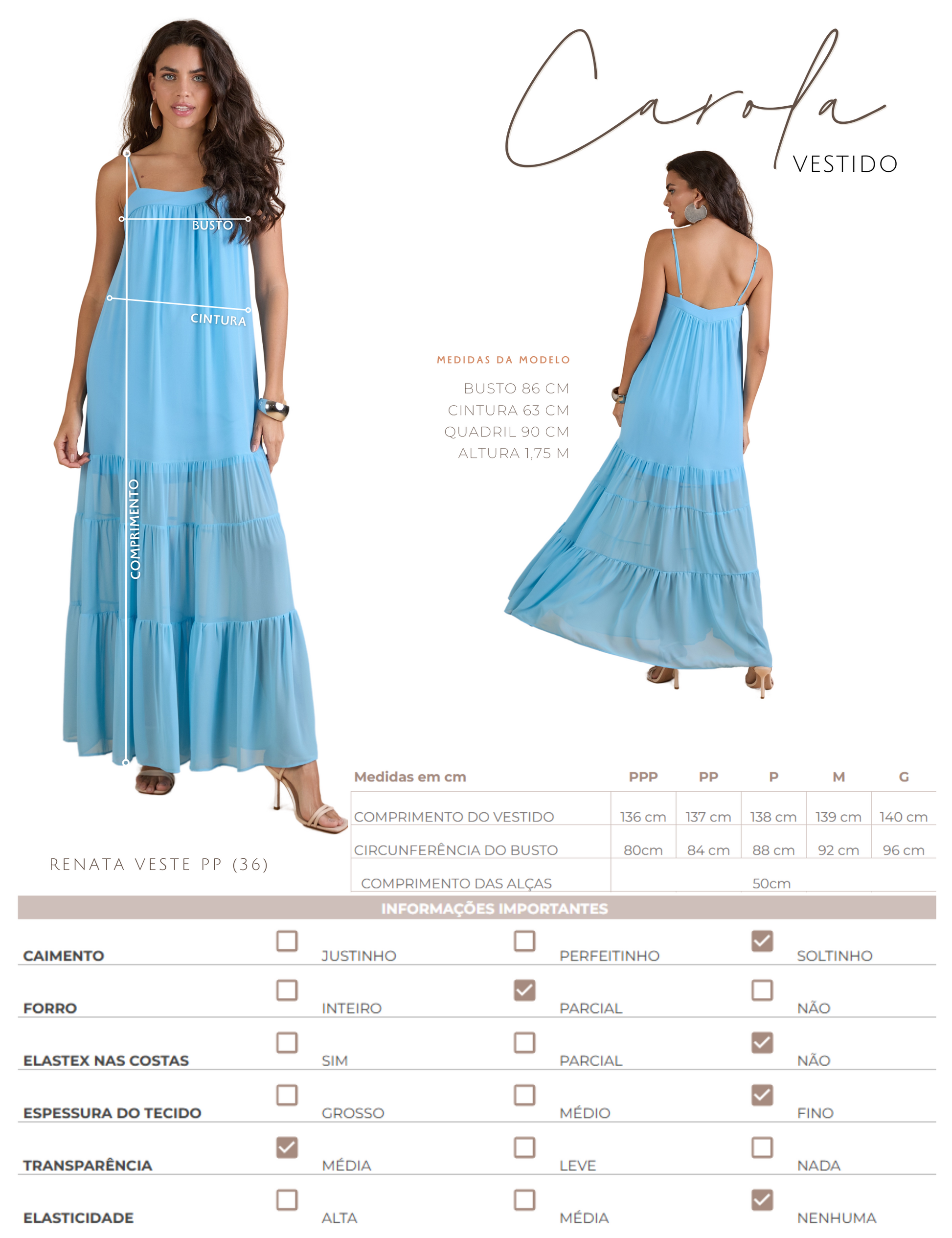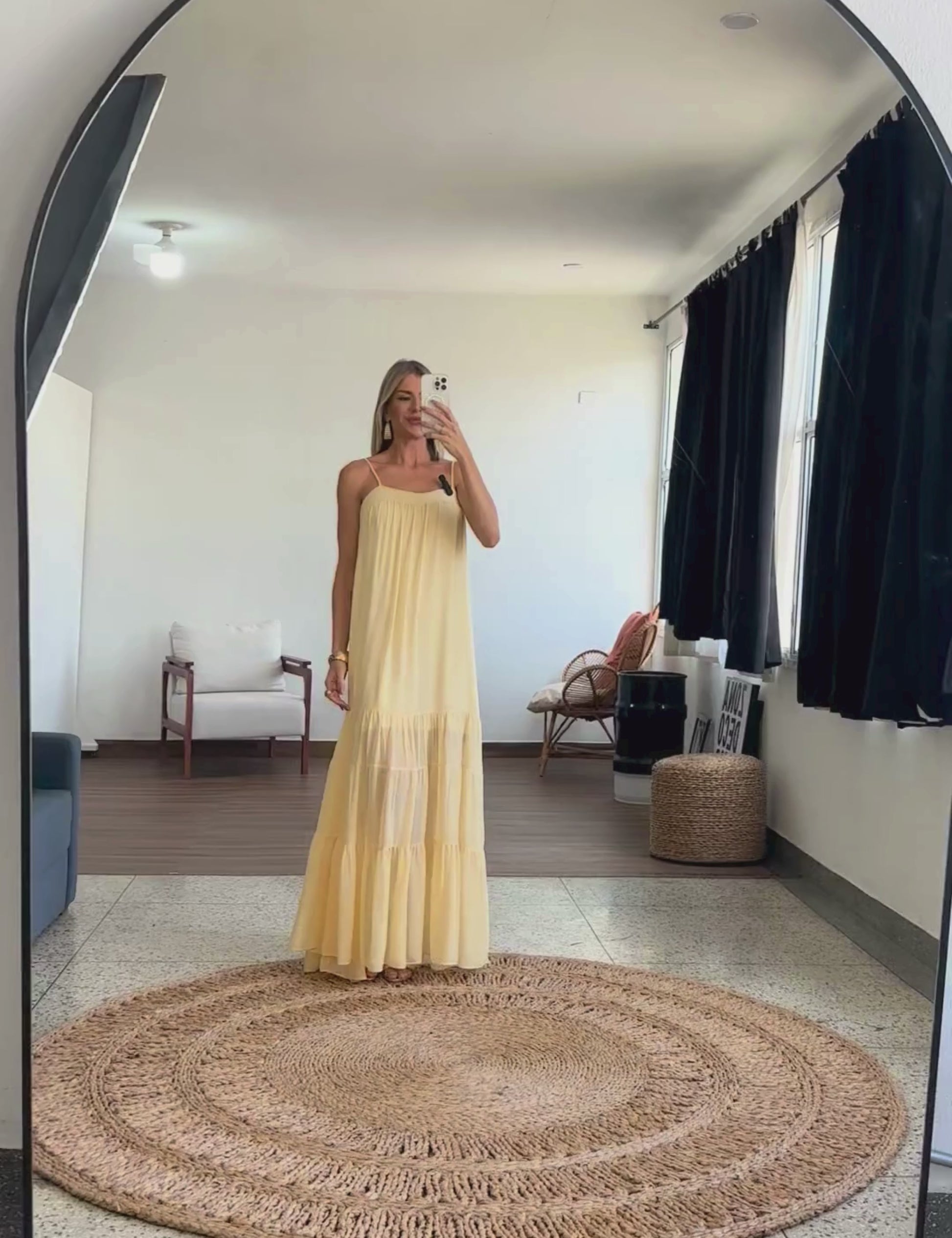 Vestido longo confeccionado em crepe com forro. A peça tem modelagem ampla e possui decote reto com pala, recortes em camadas, franzidos e alças finas reguláveis.