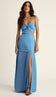 Vestido longo sem mangas confeccionado em alfaiataria acetinada com efeito amassadinho. Possui tecido duplo no busto para não ficar transparente, decote coração com nó em transpasse fixo no centro do busto deixando franzidinho, silicone elástico interno no decote para maior sustentação, lastex nas costas para melhor ajuste ao corpo, pala com recortes na cintura, busto fixo à saia apenas por recorte frontal, deixando toda a região da cintura à mostra; na saia possui forro, elástico interno na cintura, fechamento traseiro por zíper invisível e modelagem justinha até a altura do quadril, onde conta com recorte horizontal e saia soltinha logo em seguida.
