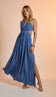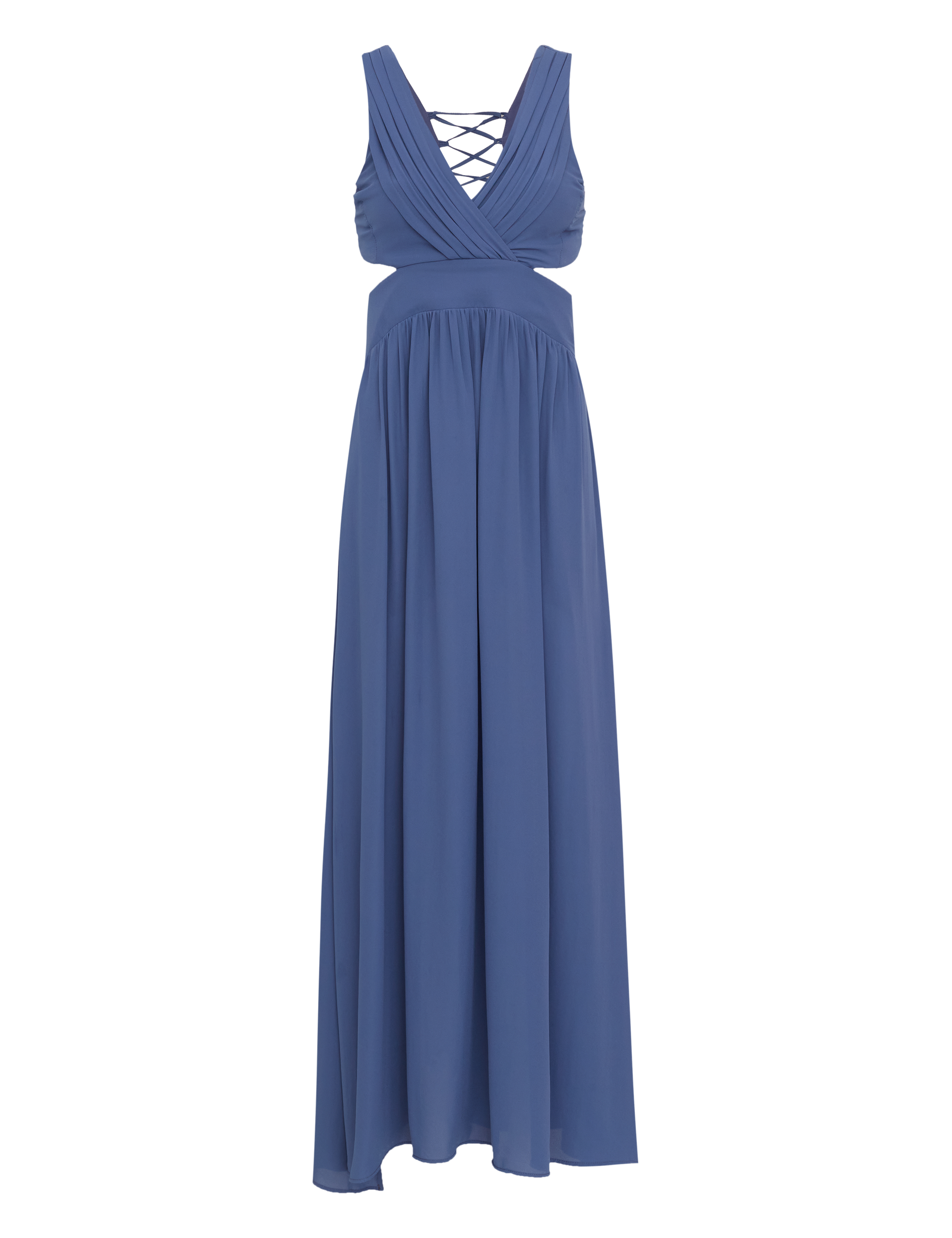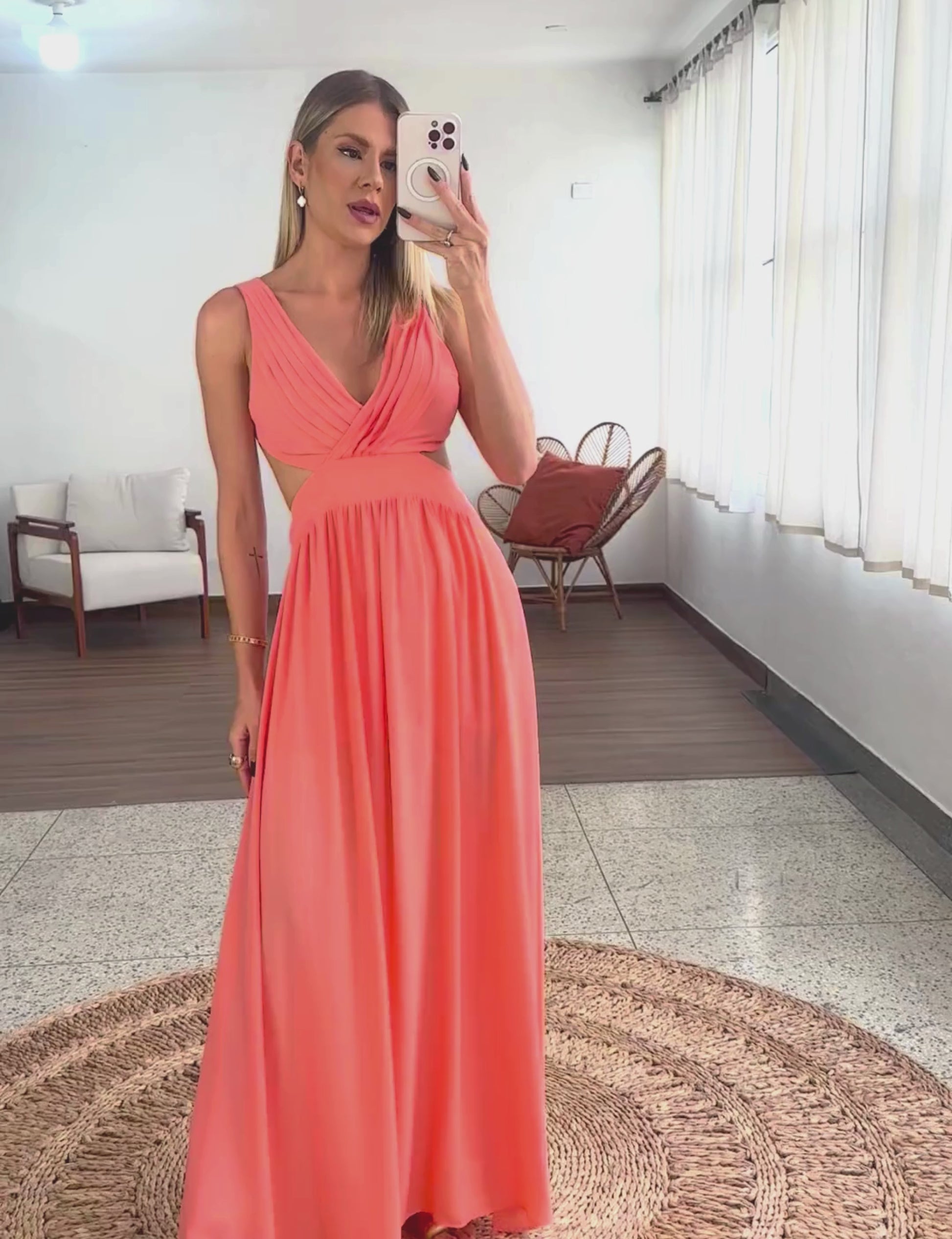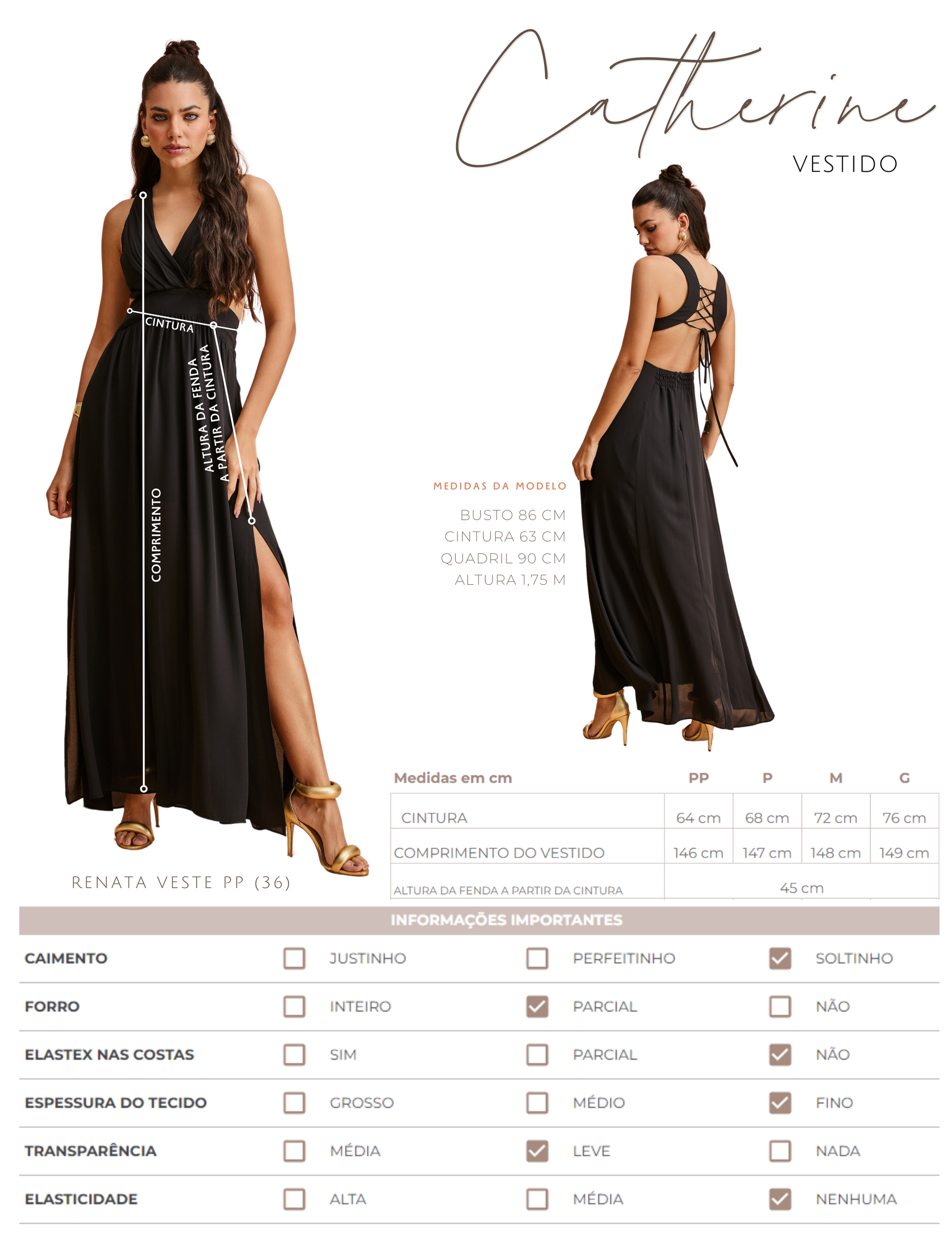 Vestido longo confeccionado em crepe com forro. O decote é transpassado com detalhe de pregas e aberturas laterais. Nas costas possui alças largas em decote nadador com alças finas cruzadas para amarração. A saia possui fendas laterais, pala na cintura com franzidos e fechamento traseiro por zíper invisível e detalhe de lastex para maior conforto.