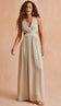 Vestido longo confeccionado em crepe com forro. O decote é transpassado com detalhe de pregas e aberturas laterais. Nas costas possui alças largas em decote nadador com alças finas cruzadas para amarração. A saia possui fendas laterais, pala na cintura com franzidos e fechamento traseiro por zíper invisível e detalhe de lastex para maior conforto.