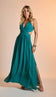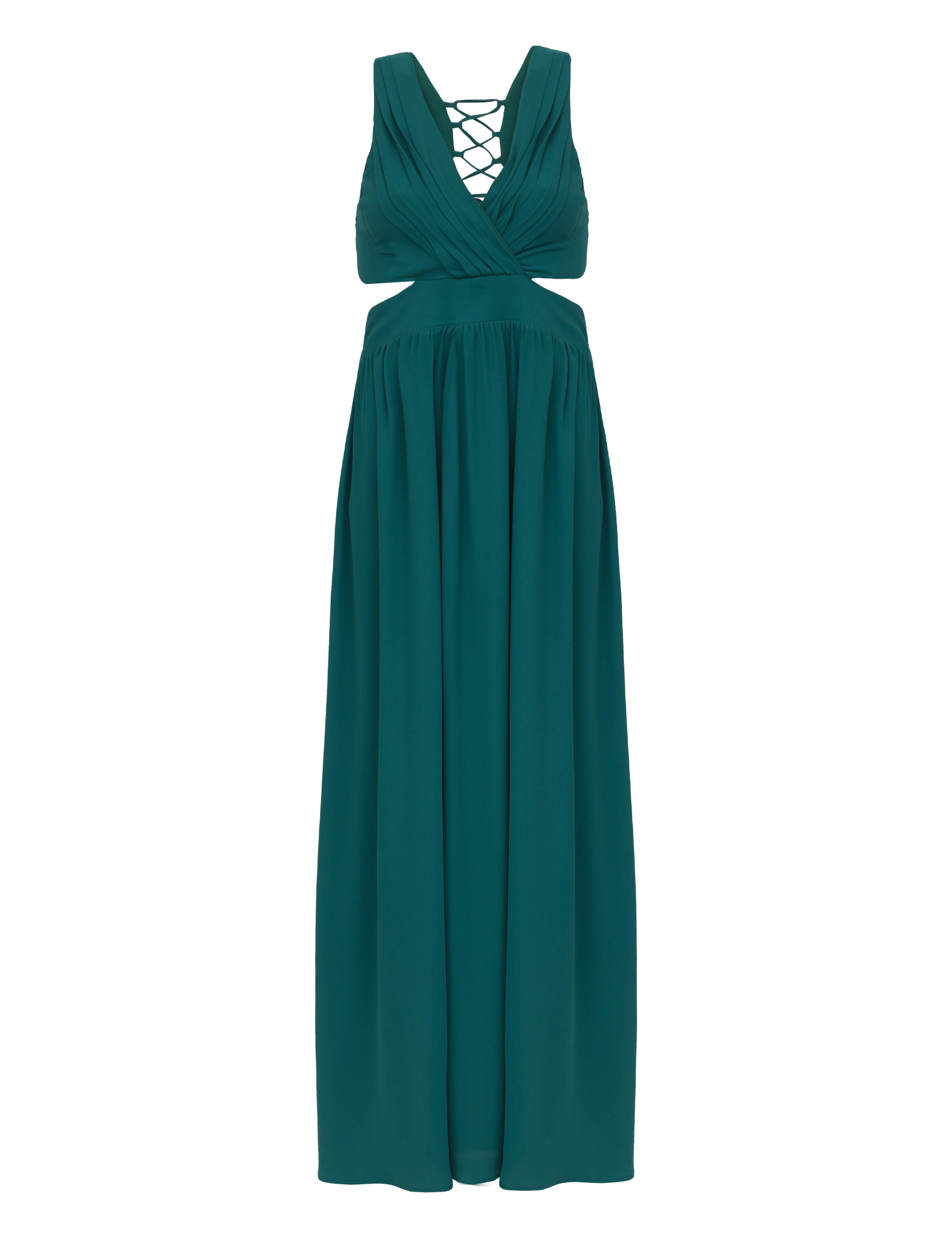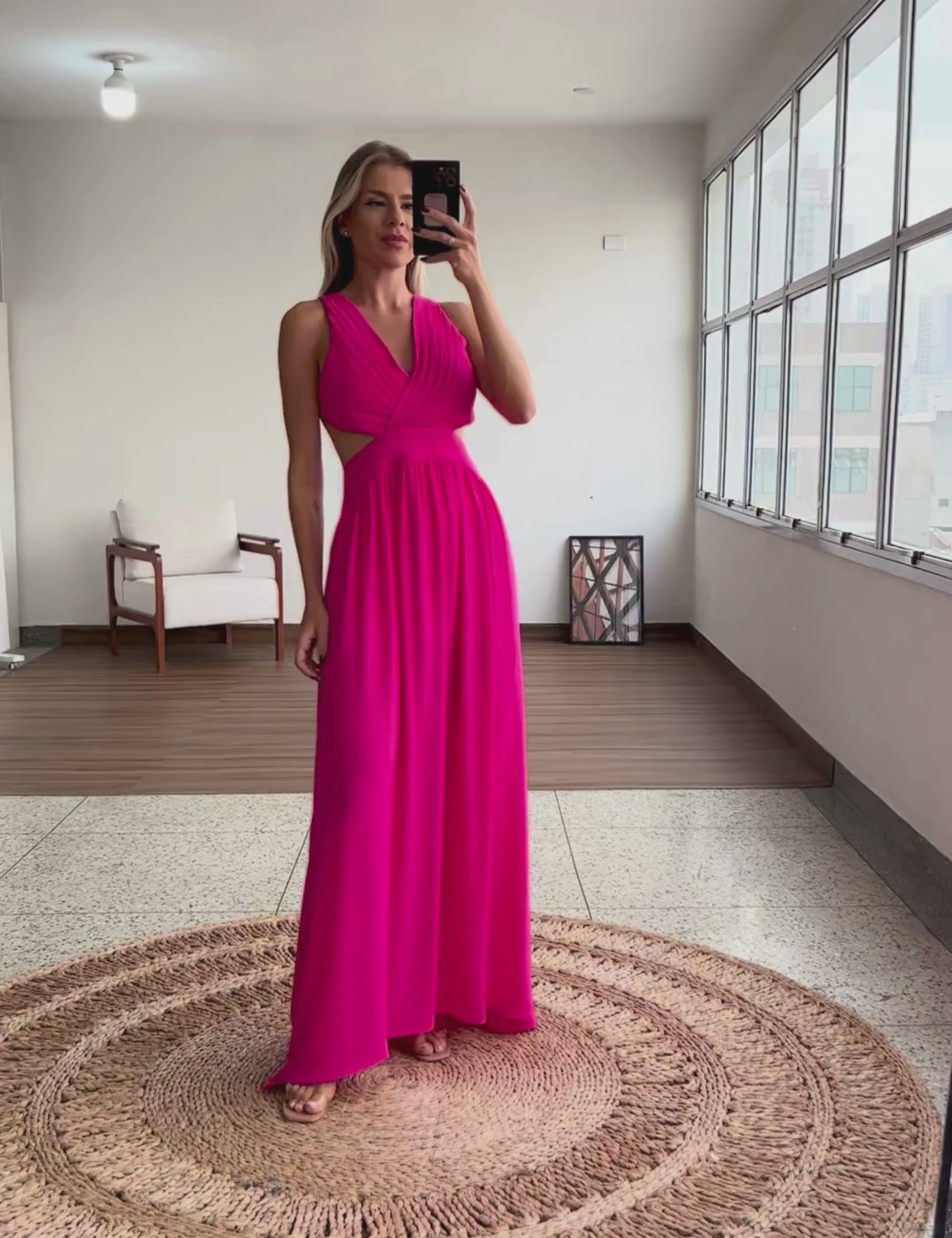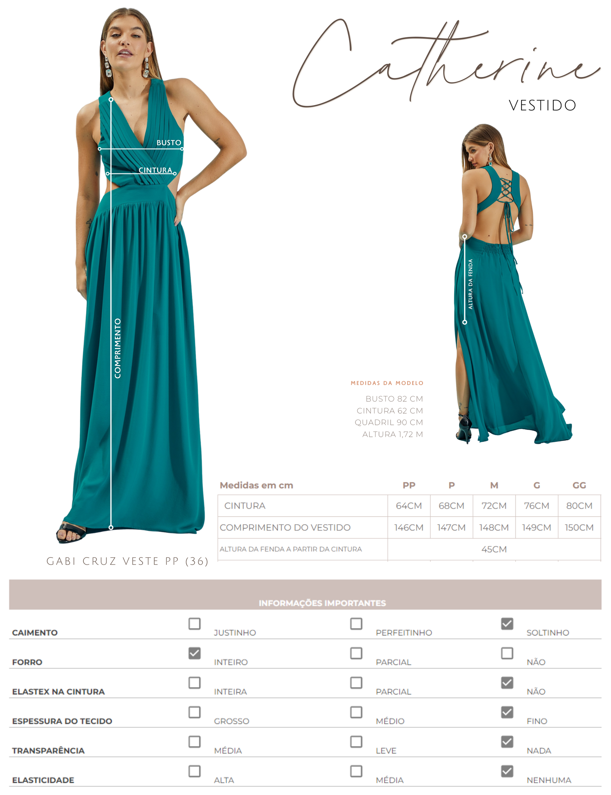 Vestido longo confeccionado em crepe com forro. O decote é transpassado com detalhe de pregas e aberturas laterais. Nas costas possui alças largas em decote nadador com alças finas cruzadas para amarração. A saia possui fendas laterais, pala na cintura com franzidos e fechamento traseiro por zíper invisível e detalhe de lastex para maior conforto.