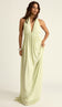 Vestido longo frente única confeccionado em crepe leve com forro. Possui elástico interno franzido abaixo do busto circundando o tórax, marcando a silhueta nessa região em estilo império; decote em V composto por duas tiras largas que tem o fechamento por botões esmaltados na nuca, de onde saem tirinhas compridas para amarrar nas costas de diversas formas diferentes, criando decotes lindíssimos; ponteiras de metal em formato de conchinha nas tirinhas e saia bem soltinha e fluida, que dá muita leveza ao look.