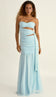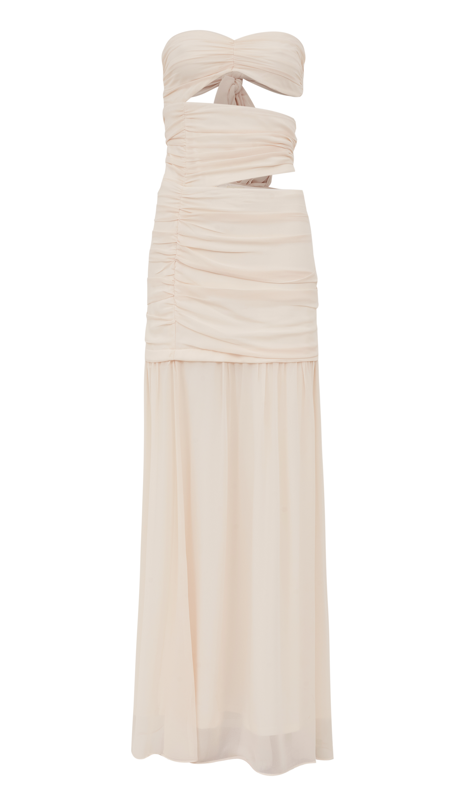 Vestido longo confeccionado em crepe leve com forro. Não possui mangas e conta com decote coração com silicone elástico interno para maior segurança, busto solto fixo apenas na lateral; franzido no centro e nas laterais também, tiras fixas compridas para amarração e fechamento nas costas; faixa comprida na cintura também fixa apenas em uma das laterais com fechamento por amarração, elástico interno para melhor ajuste ao corpo, franzidos verticais para dar volume e saia logo abaixo com recorte na altura do quadril também com franzidinhos nas laterais que dão volume à peça, seguido de tecido mais soltinho até a barra.
