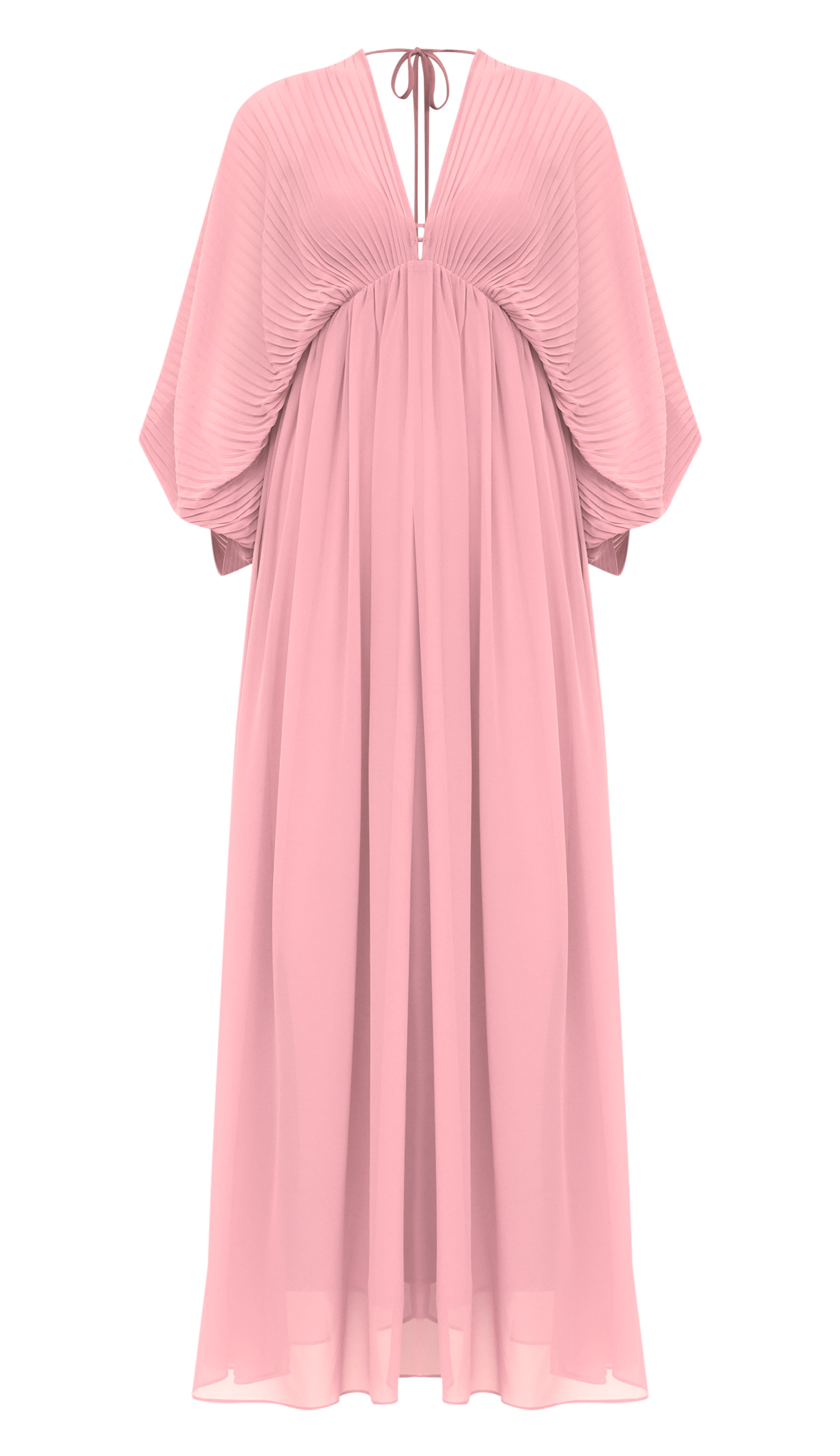 Vestido longo confeccionado em crepe leve. Possui parte do busto toda plissada, decote em V profundo frente e costas, mangas morcego 7/8 estilo kimono, modelagem império com elástico franzidinho logo abaixo do busto demarcando a região, saia soltinha bem fluida com forro, tirinha para amarrar nas costas com ponteiras de metal com formato de conchinha e fechamento traseiro por zíper invisível. Acompanha top estilo biquíni no mesmo tecido com forro, alcinhas reguláveis, elástico abaixo do busto para melhor ajuste e fechamento traseiro regulável por gancho de metal.