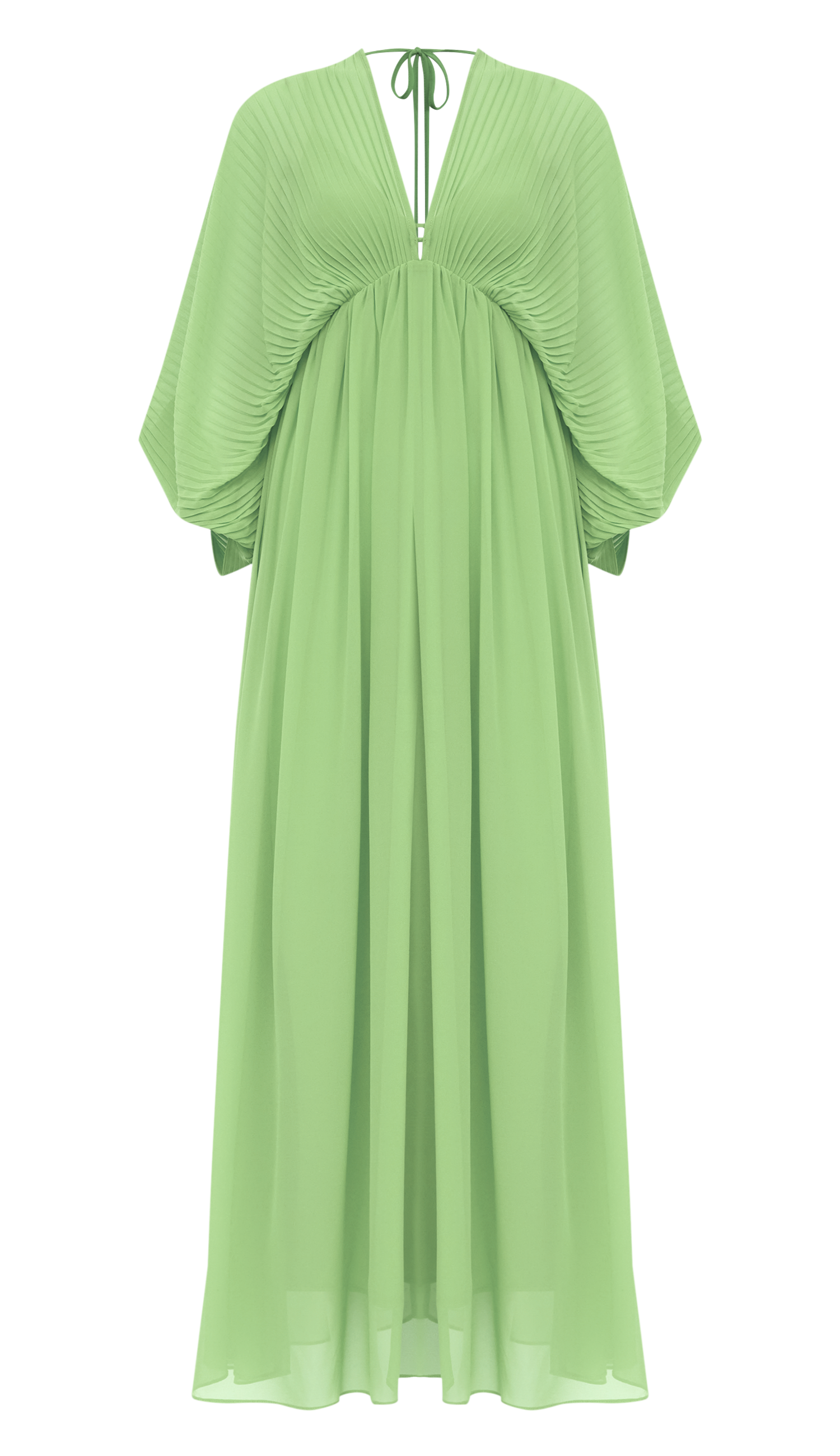 Vestido longo confeccionado em crepe leve. Possui parte do busto toda plissada, decote em V profundo frente e costas, mangas morcego 7/8 estilo kimono, modelagem império com elástico franzidinho logo abaixo do busto demarcando a região, saia soltinha bem fluida com forro, tirinha para amarrar nas costas com ponteiras de metal com formato de conchinha e fechamento traseiro por zíper invisível. Acompanha top estilo biquíni no mesmo tecido com forro, alcinhas reguláveis, elástico abaixo do busto para melhor ajuste e fechamento traseiro regulável por gancho de metal.