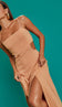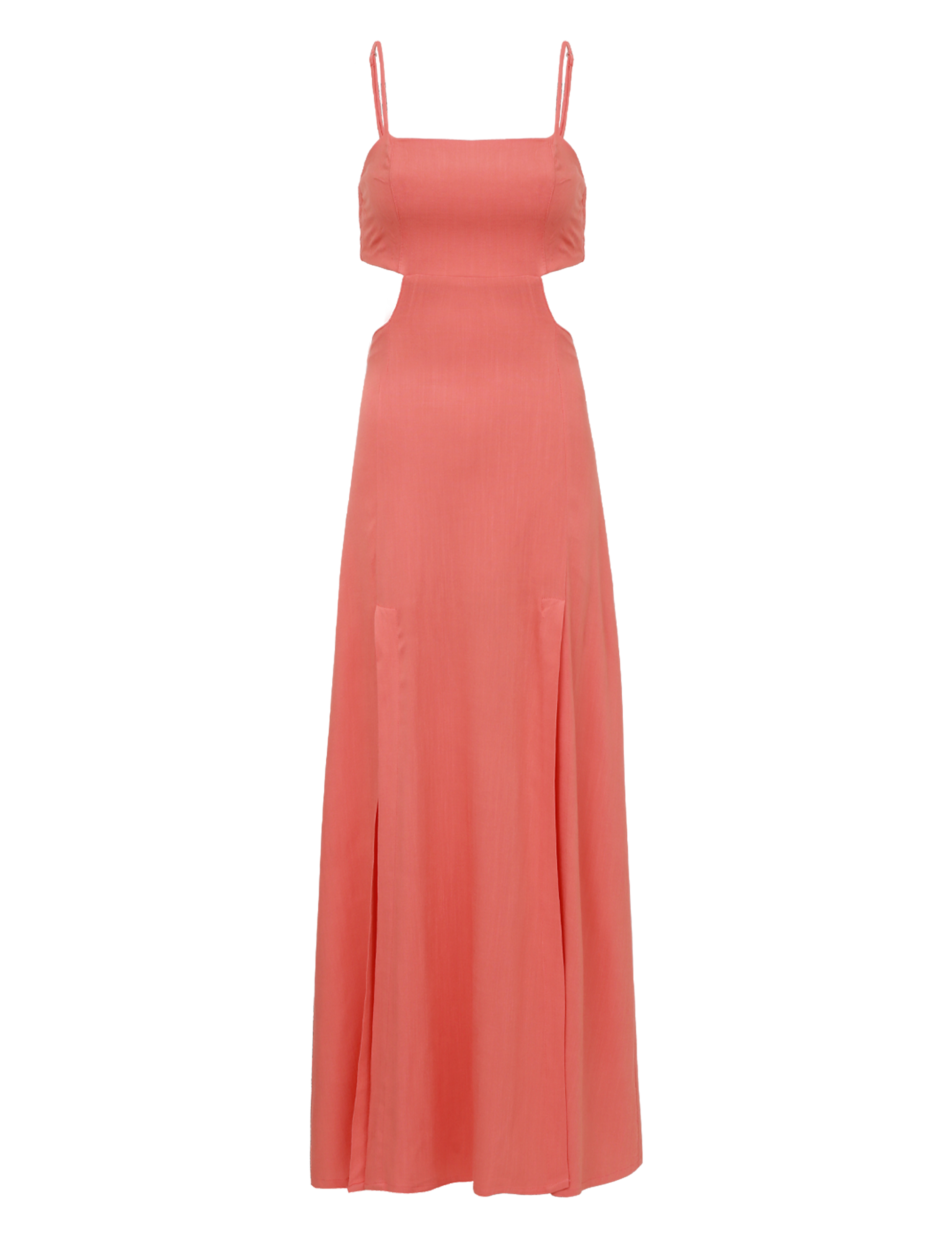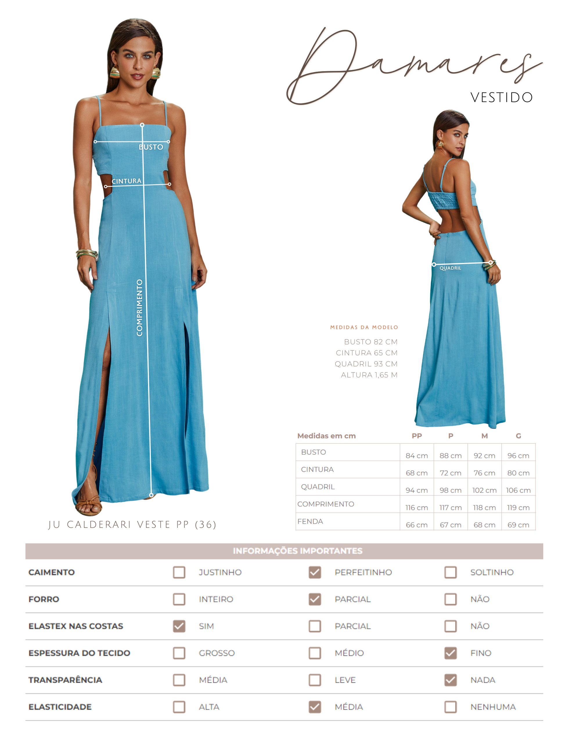 Vestido longo com forro, confeccionado em viscose mais encorpada com toque e aspecto de linho. Possui decote reto; alcinhas reguláveis; busto fixo à saia apenas por recorte frontal, deixando toda a região da cintura à mostra; lastex franzido nas costas; fechamento traseiro por zíper invisível na saia e fendas frontais.