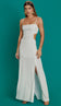 Vestido longo com forro, confeccionado em viscose mais encorpada com toque e aspecto de linho. Possui decote reto; alcinhas reguláveis; busto fixo à saia apenas por recorte frontal, deixando toda a região da cintura à mostra; lastex franzido nas costas; fechamento traseiro por zíper invisível na saia e fendas frontais.