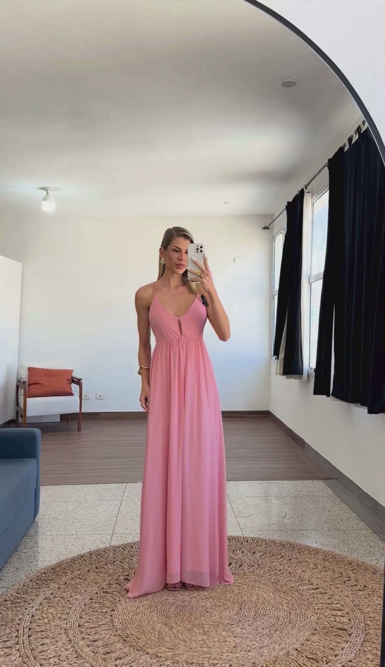Vestido longo confeccionado em crepe leve com forro. Possui modelagem império com marcação logo abaixo do busto seguido de saia soltinha; decote em V, franzidinho logo abaixo do busto, alcinhas reguláveis cruzadas nas costas criando um lindo decote, fechamento traseiro por zíper invisível e saia solta com tecido leve, bem fluido e esvoaçante.
