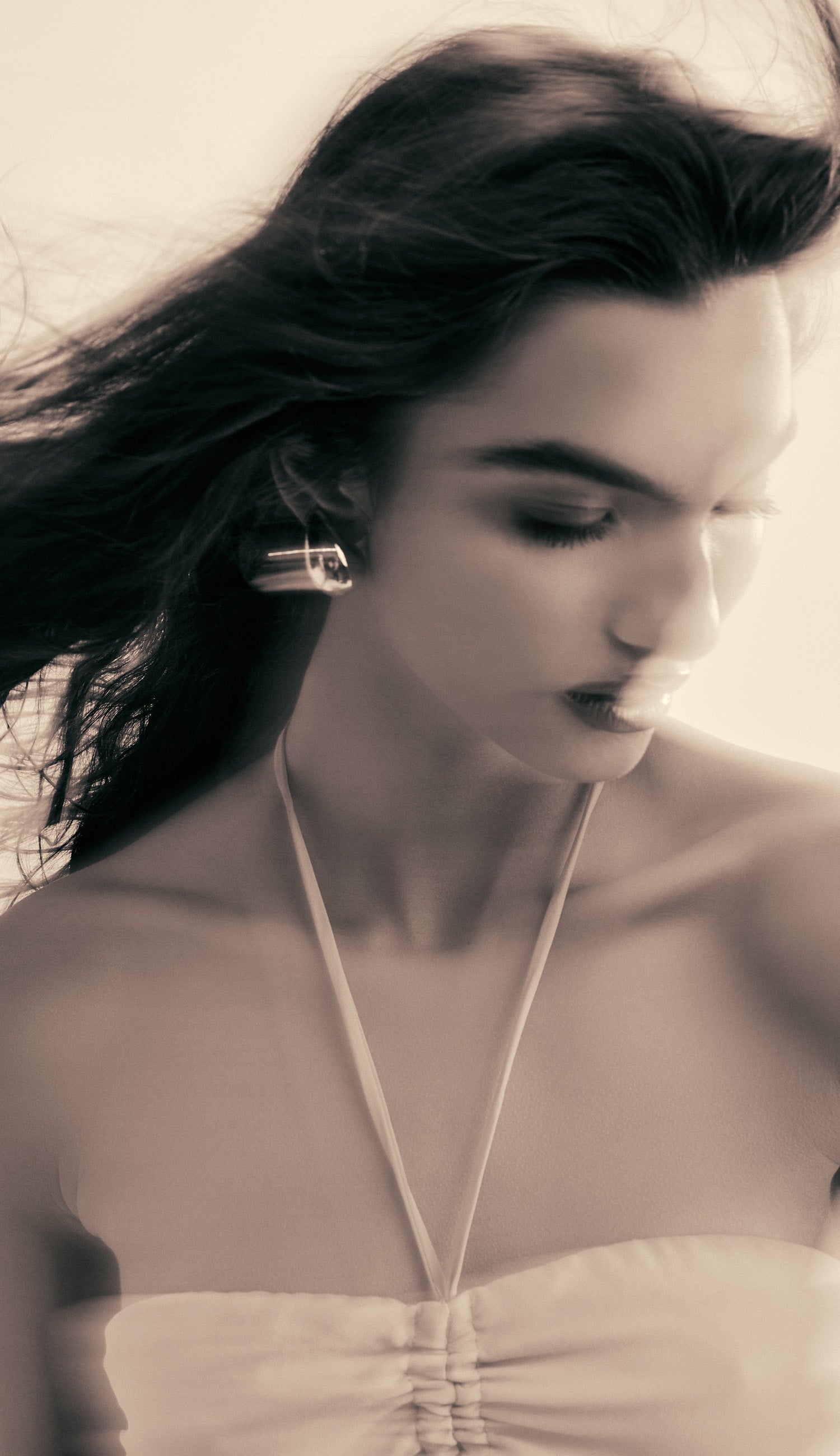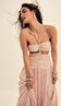 Vestido longo confeccionado em crepe com forro longo na saia. O busto é fixo à saia apenas por recorte frontal, deixando toda a região da cintura à mostra. Possui tecido duplo no busto para não ficar transparente, decote coração com silicone interno para maior segurança, franzido no centro com tirinha comprida embutida para amarrar, que tem ponteiras de metal em formato de conchinha e fechamento das costas também por amarração com tirinha que tem a mesma ponteira. Logo abaixo do busto, na tirinha que une as duas partes da peça, possui uma delicada fivelinha de metal em formato de estrela do mar; conta ainda com um charmoso detalhe todo drapeado no quadril, saia bem soltinha com nesgas que dão fluidez ao look e fechamento traseiro da saia feito por zíper invisível.