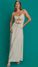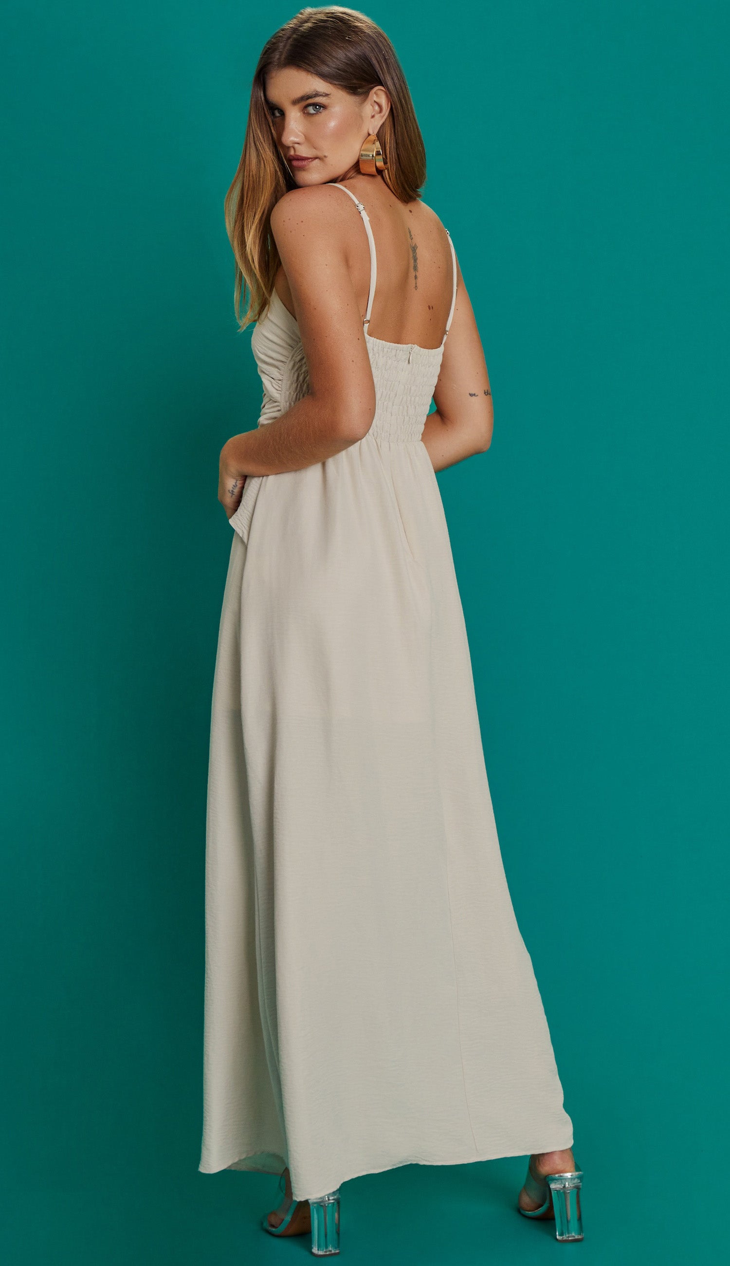 Vestido longo com forro na saia, confeccionado em poliéster com aspecto de liocel e efeito amassadinho. Possui decote em V com detalhes em nó, o mesmo detalhe com recortes e vazados também na cintura; alcinhas reguláveis; lastex franzido nas costas e fechamento traseiro por zíper invisível. O tecido garante praticidade e elegância, pois, devido à sua composição, não amassa facilmente e o aspecto de 'tecido nobre' dá um ar sofisticado ao look.