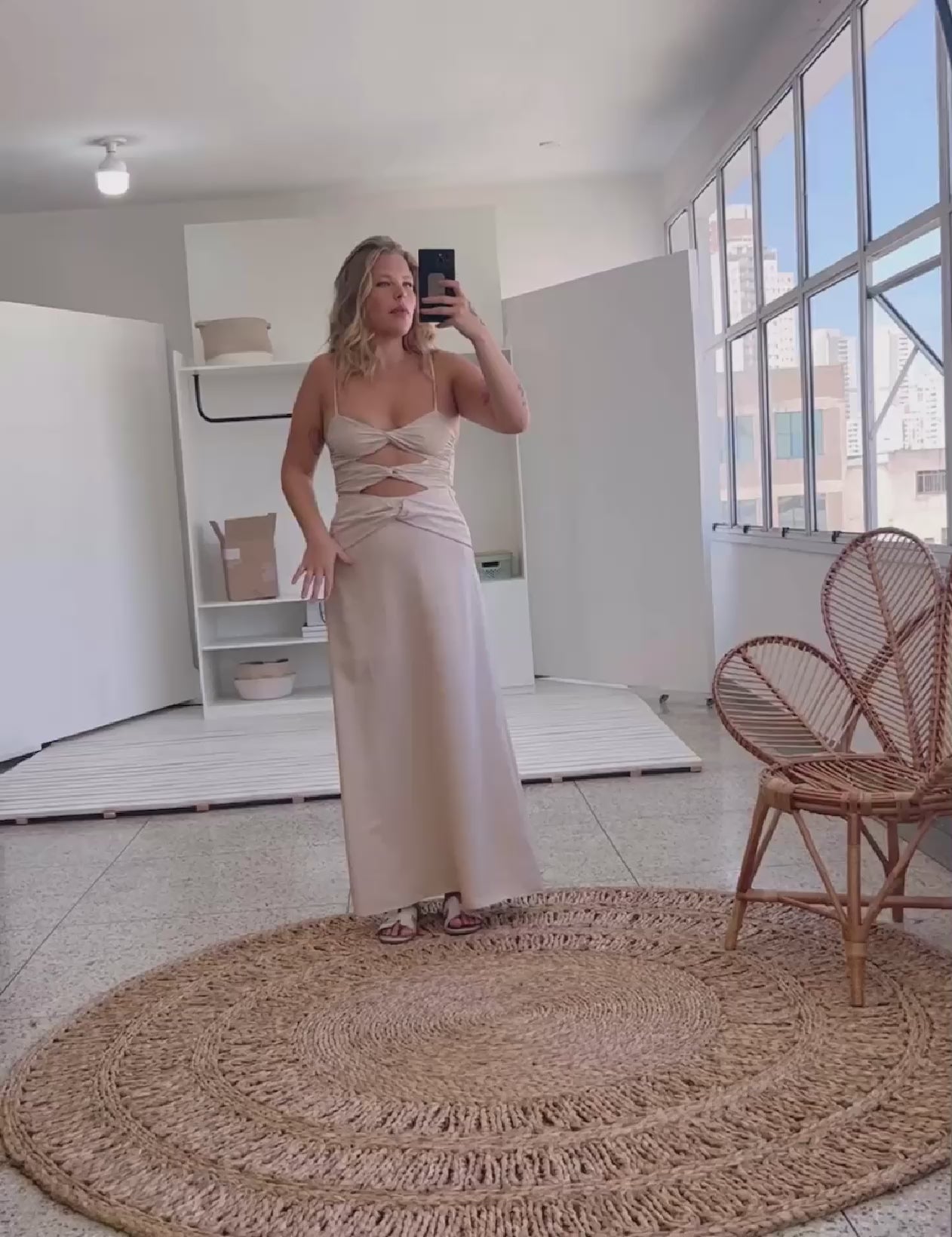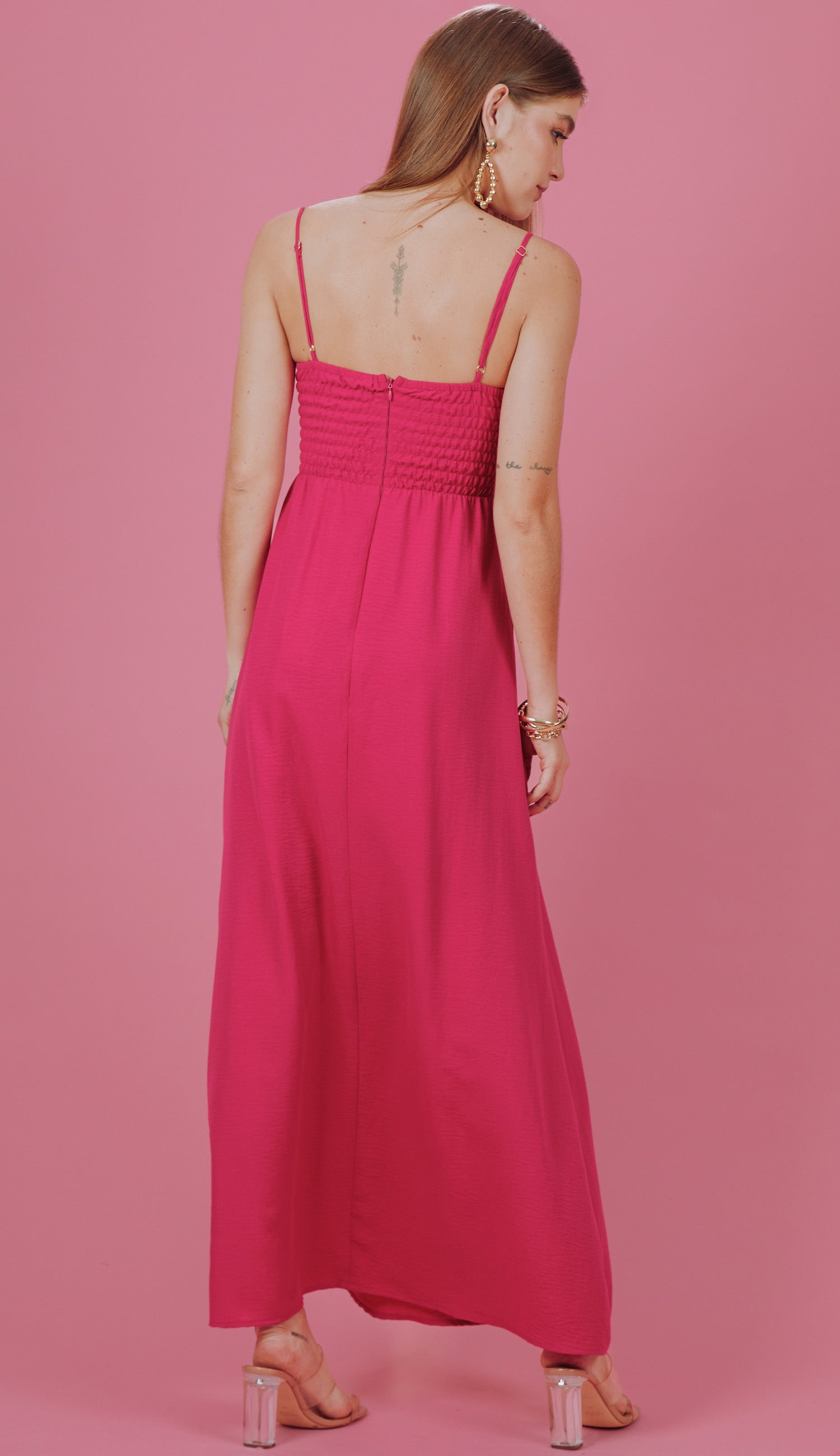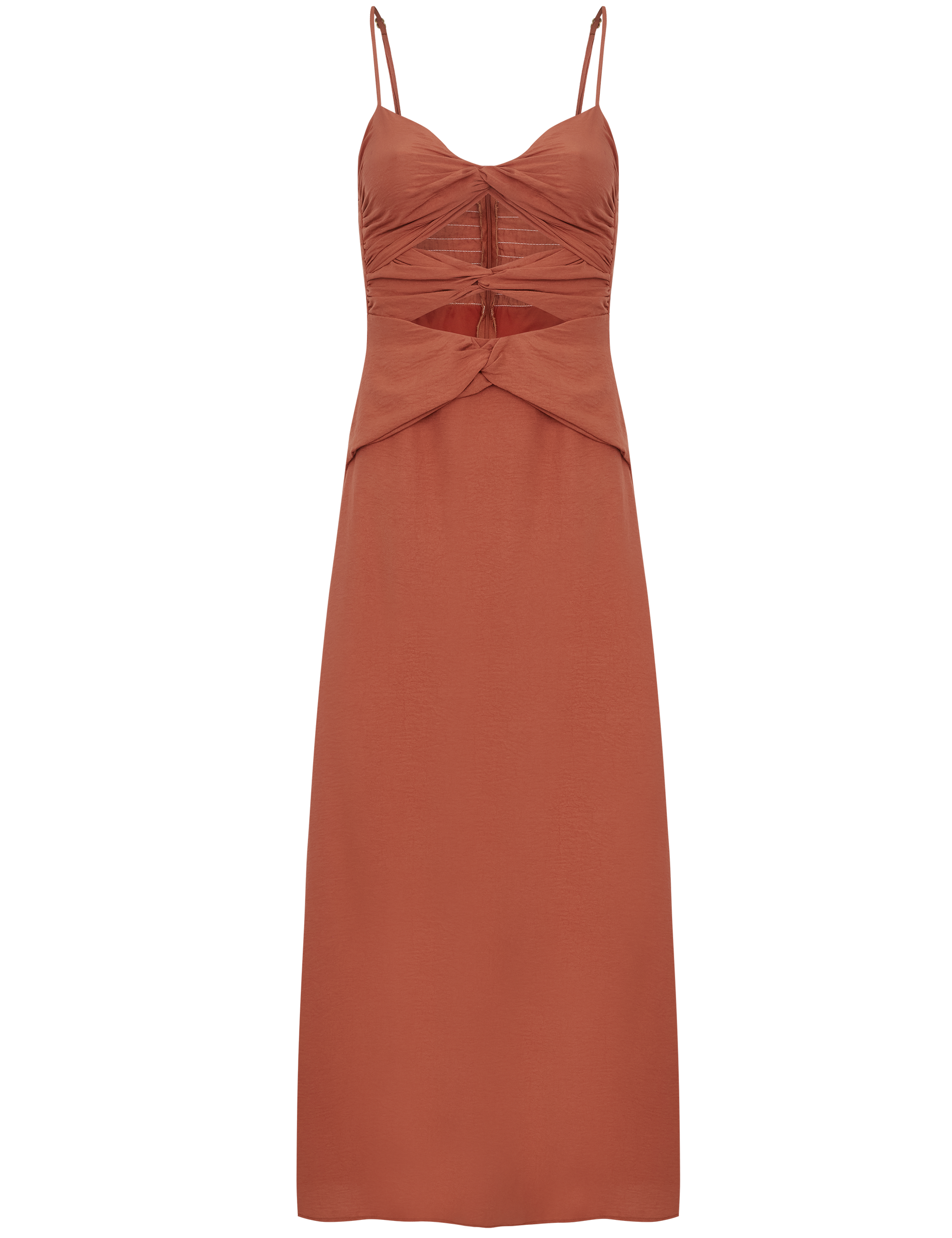 Vestido longo com forro na saia, confeccionado em poliéster com aspecto de liocel e efeito amassadinho. Possui decote em V com detalhes em nó, o mesmo detalhe com recortes e vazados também na cintura; alcinhas reguláveis; lastex franzido nas costas e fechamento traseiro por zíper invisível. O tecido garante praticidade e elegância, pois, devido à sua composição, não amassa facilmente e o aspecto de 'tecido nobre' dá um ar sofisticado ao look.