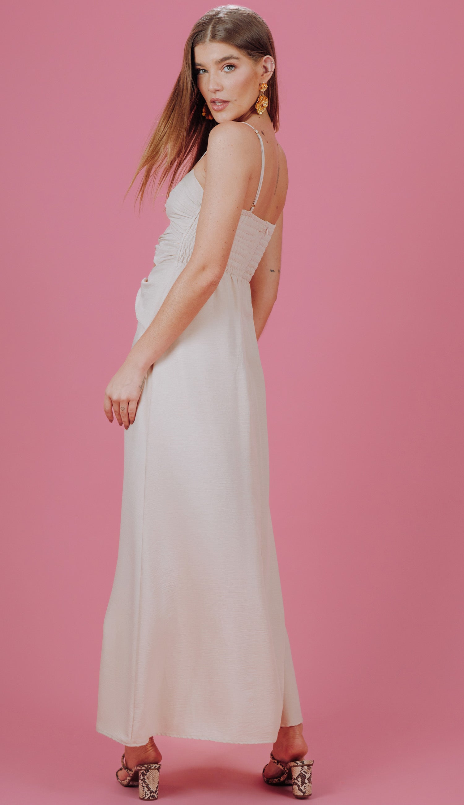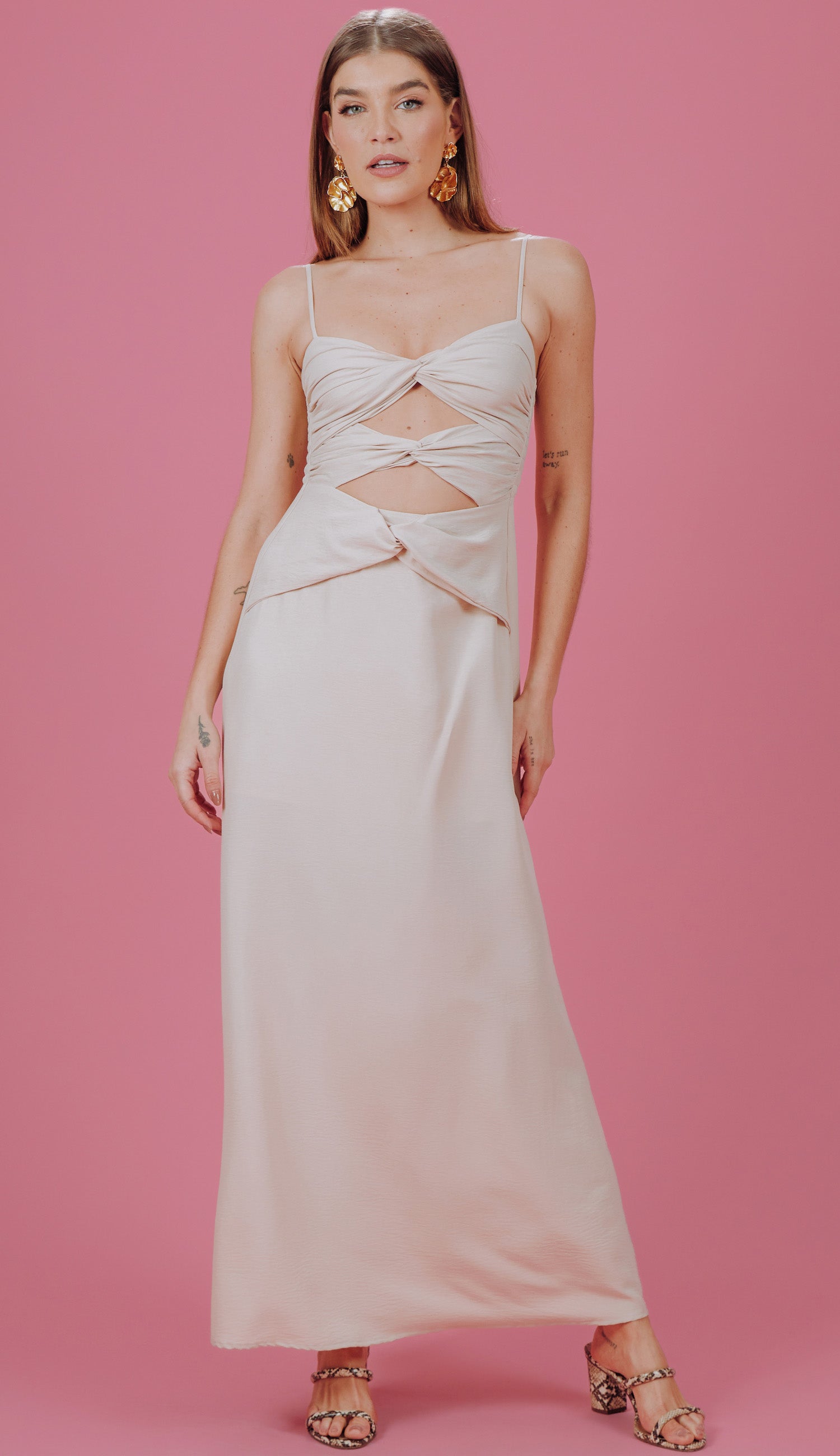 Vestido longo com forro na saia, confeccionado em poliéster com aspecto de liocel e efeito amassadinho. Possui decote em V com detalhes em nó, o mesmo detalhe com recortes e vazados também na cintura; alcinhas reguláveis; lastex franzido nas costas e fechamento traseiro por zíper invisível. O tecido garante praticidade e elegância, pois, devido à sua composição, não amassa facilmente e o aspecto de 'tecido nobre' dá um ar sofisticado ao look.