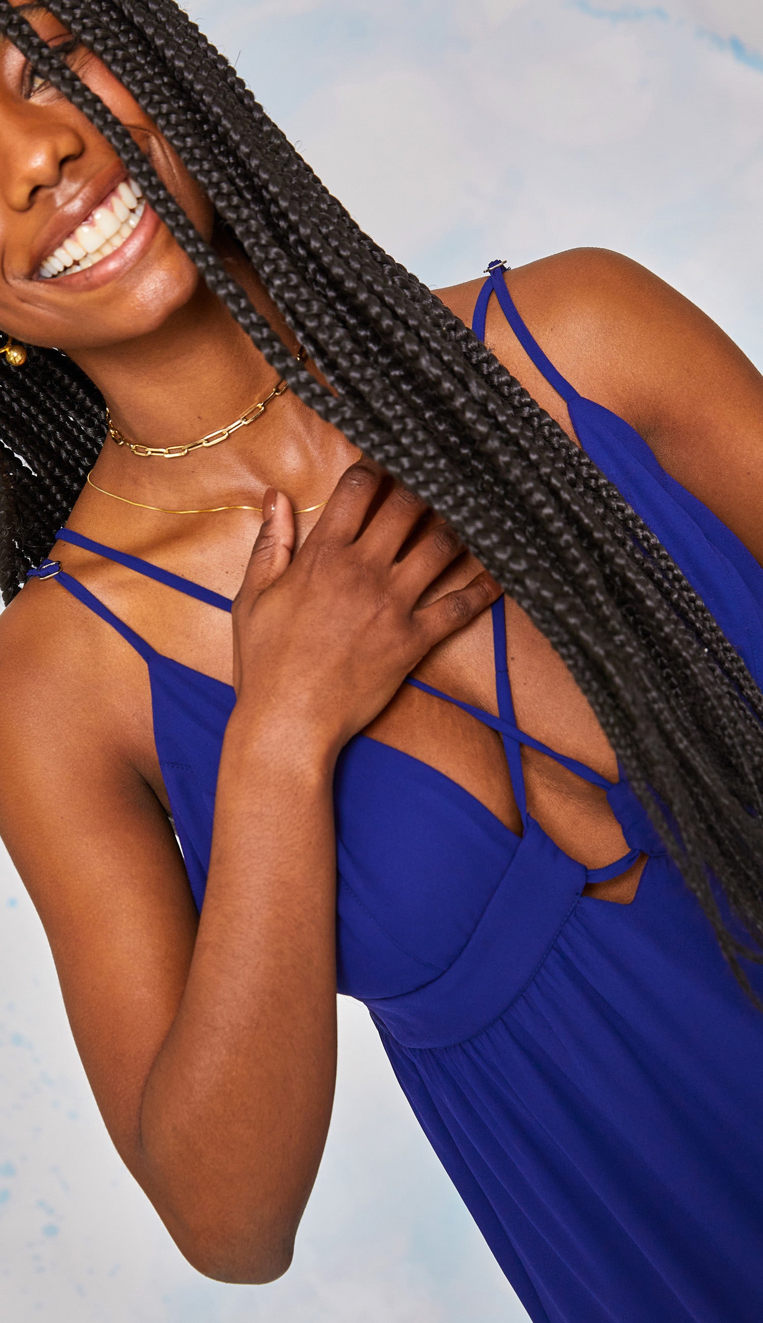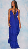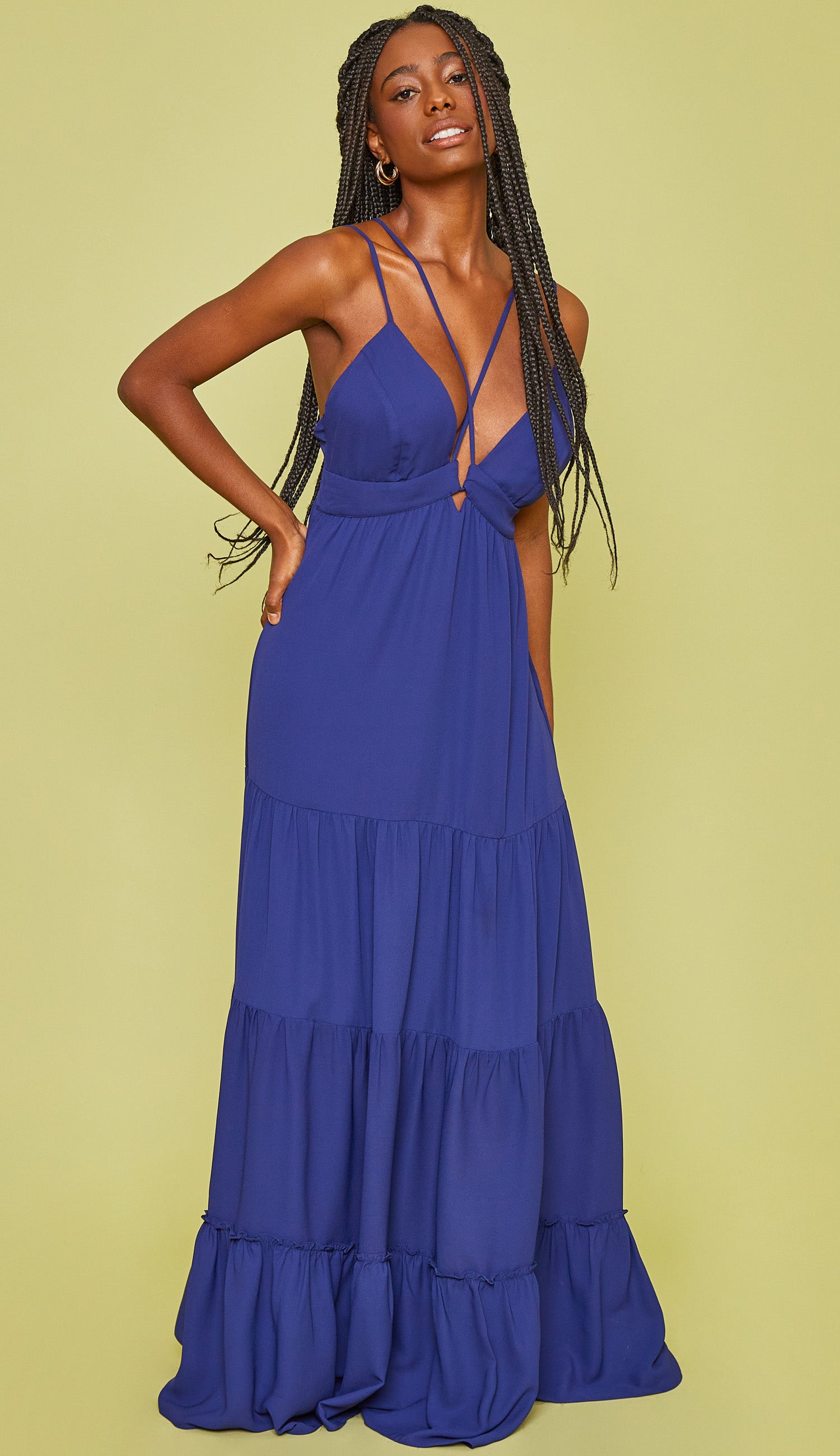 Vestido longo confeccionado em crepe com forro. Possui fechamento lateral por zíper invisível, alcinhas reguláveis, decote em V com abertura e detalhe de tirinha comprida no centro para amarração nas costas. Conta com pala e franzidinhos abaixo do busto e saia no estilo 'três marias' com recortes franzidos e babadinho.