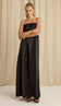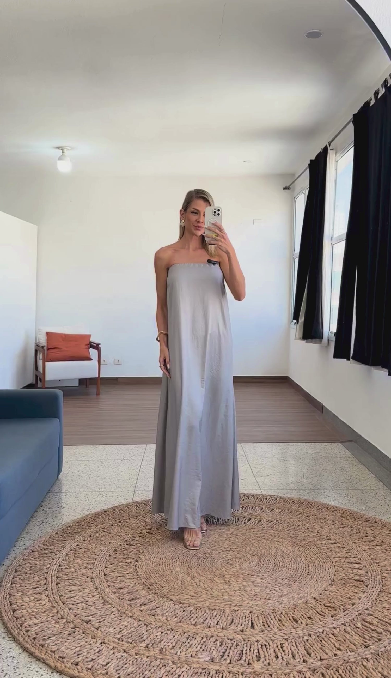 Vestido longo sem mangas confeccionado em alfaiataria acetinada. Possui decote reto com silicone elástico internono busto para maior segurança, modelagem ampla em A, elástico mais grosso franzido nas costas e fechamento traseiro por zíper de metal com pingente que tem a conchinha da Laguna gravada.