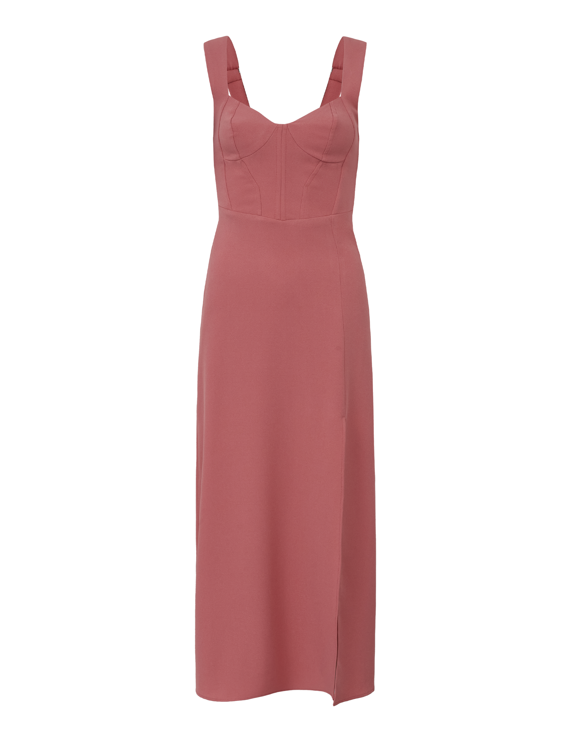 Vestido longuete confeccionado em crepe de alfaiataria. Possui decote princesa, alças mais largas com reguladores de metal, recortes no busto, pala com recortes na cintura e barbatanas no centro para estruturar a peça, fechamento lateral por zíper invisível, lastex nas costas para maior conforto e saia em "A" com forro e fenda lateral.