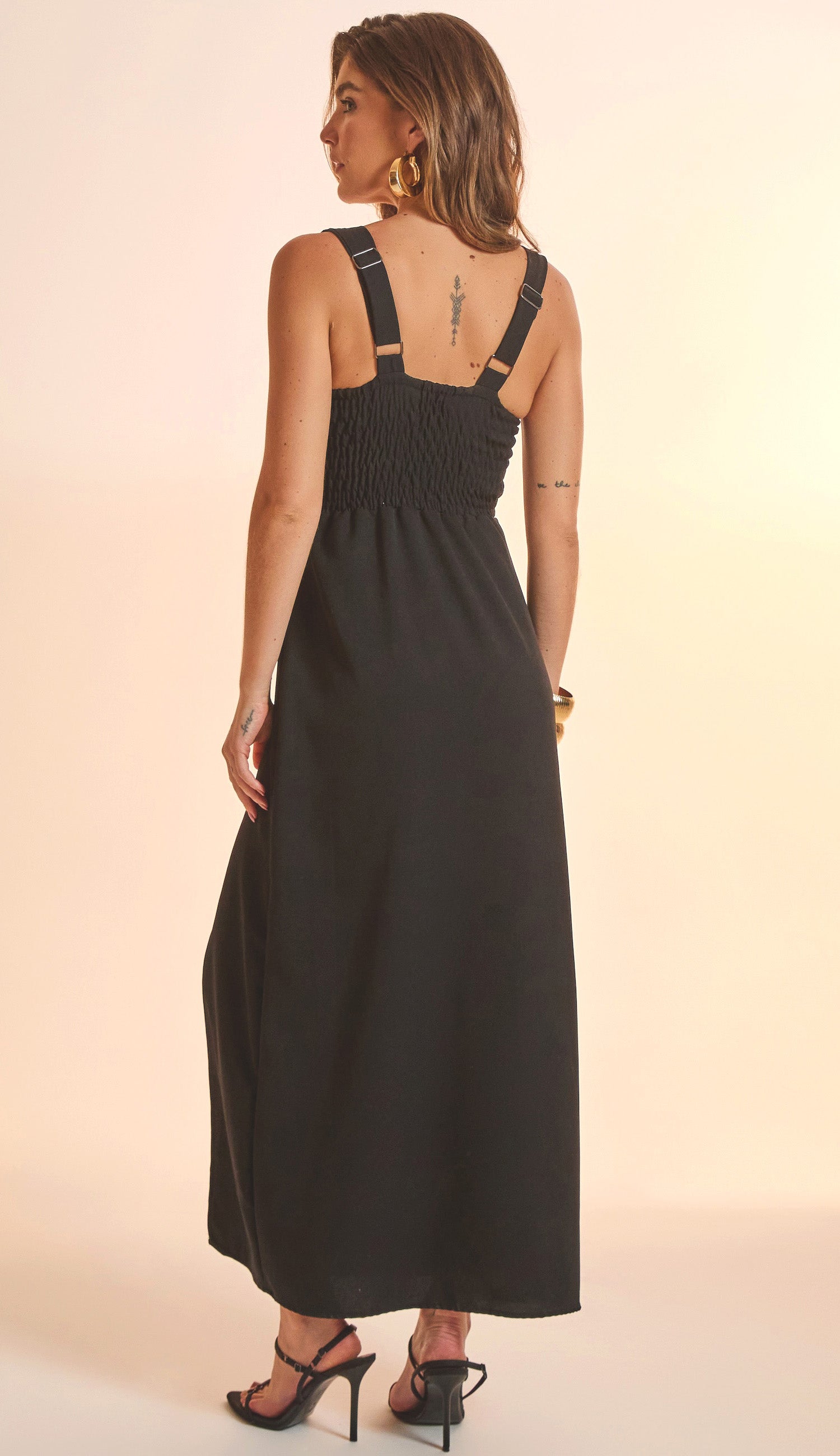 Vestido longuete confeccionado em crepe de alfaiataria. Possui decote princesa, alças mais largas com reguladores de metal, recortes no busto, pala com recortes na cintura e barbatanas no centro para estruturar a peça, fechamento lateral por zíper invisível, lastex nas costas para maior conforto e saia em "A" com forro e fenda lateral.