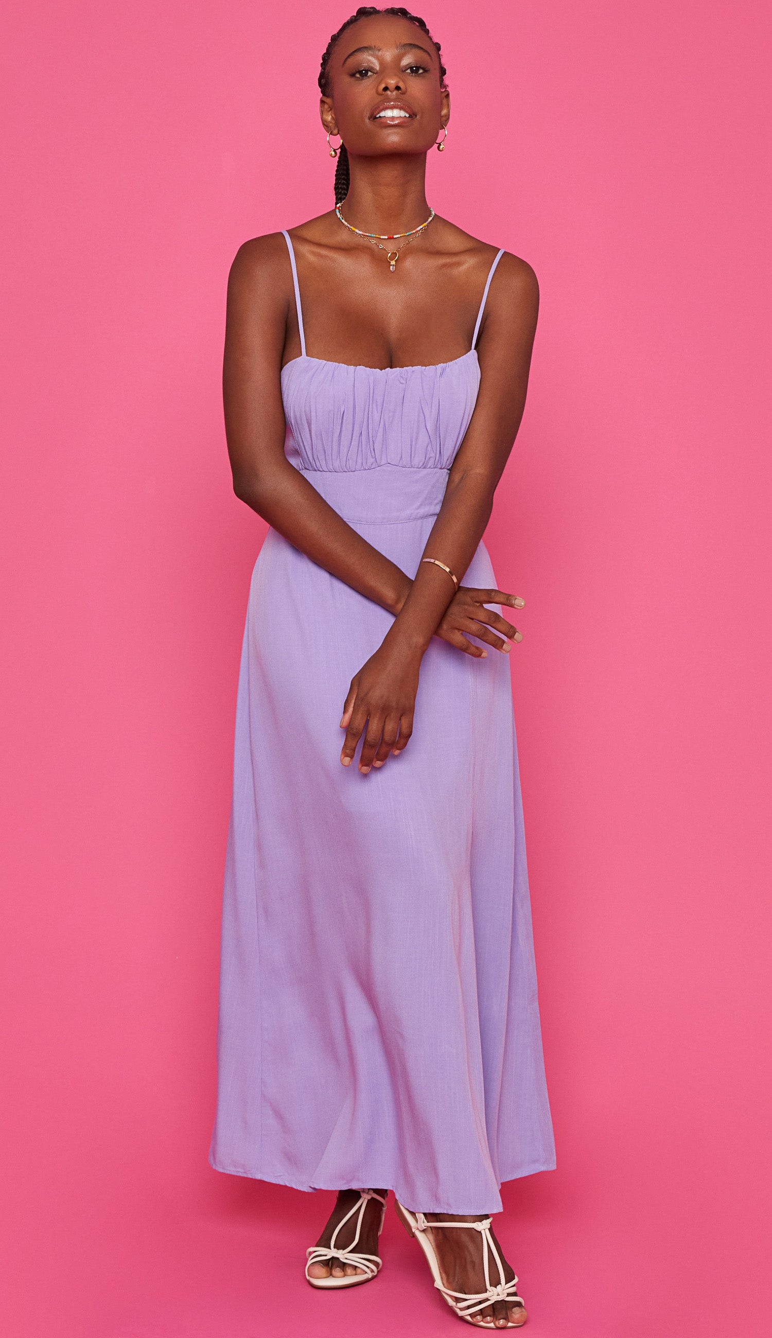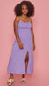 Vestido midi com forro confeccionado em viscose com toque e aspecto de linho. Possui decote reto com franzidos no busto, alças compridas para amarração nas costas, fechamento por zíper invisível, pala na cintura com recorte e fenda lateral.