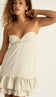Vestido curto sem mangas confeccionado em crepe texturizado com aspecto de gaze e efeito amassadinho. Possui forro na saia; tecido duplo no busto para não ficar transparente; decote coração com elástico silicone interno para maior segurança e nó em transpasse no centro do busto; modelagem império com marcação abaixo do busto e saia soltinha logo em seguida; duas camadas de babadinhos franzidos na barra e lastex nas costas para melhor ajuste ao corpo.