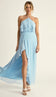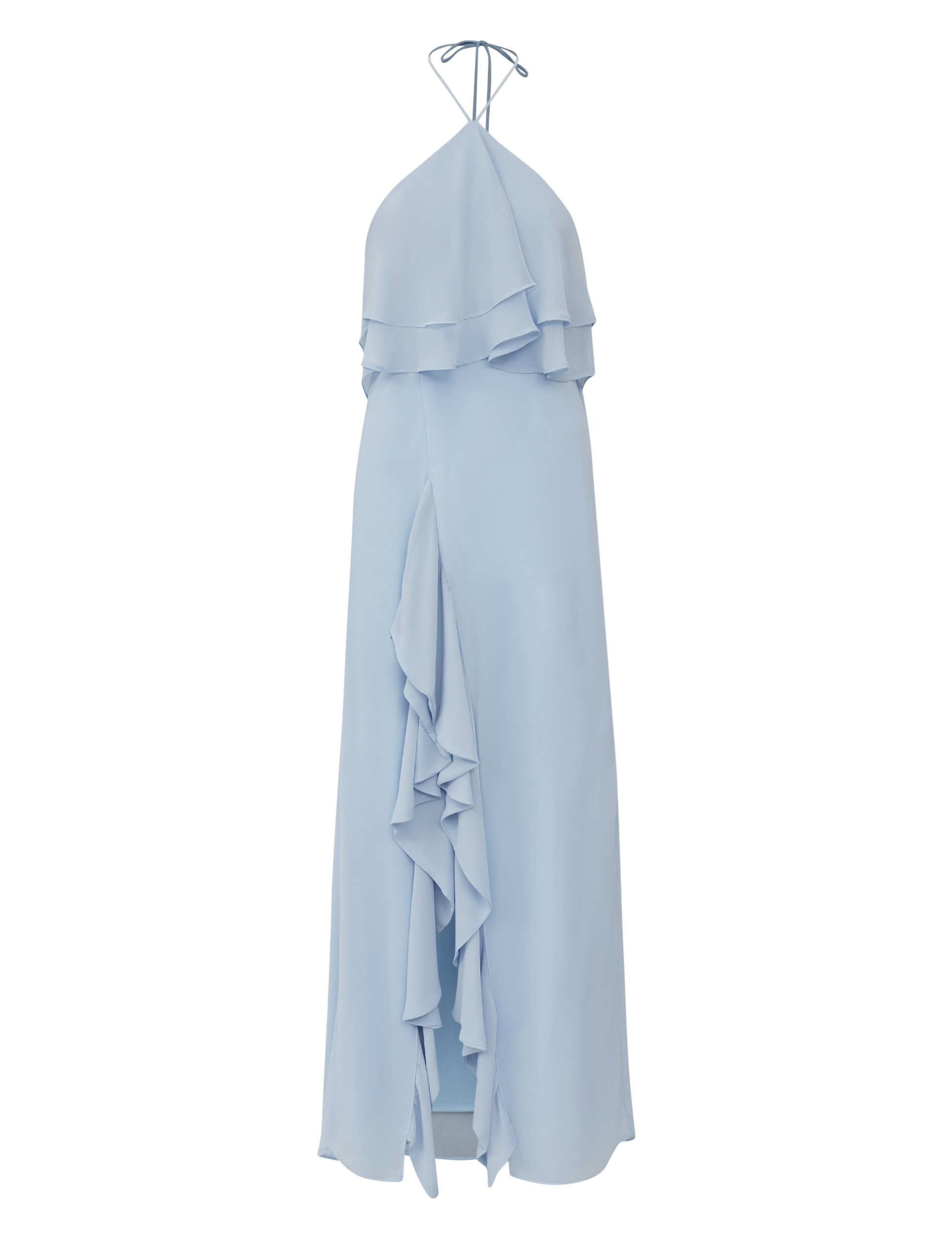 Vestido longo confeccionado em crepe leve com forro na peça inteira. Possui modelagem frente única, decote halter com tirinhas compridas com ponteiras de metal em formato de conchinha, duas camadas de babadinhos sobrepostas na região do busto, lastex franzido nas costas para melhor ajuste ao corpo e linda fenda lateral na diagonal com aplicação de babadinhos em cascata.