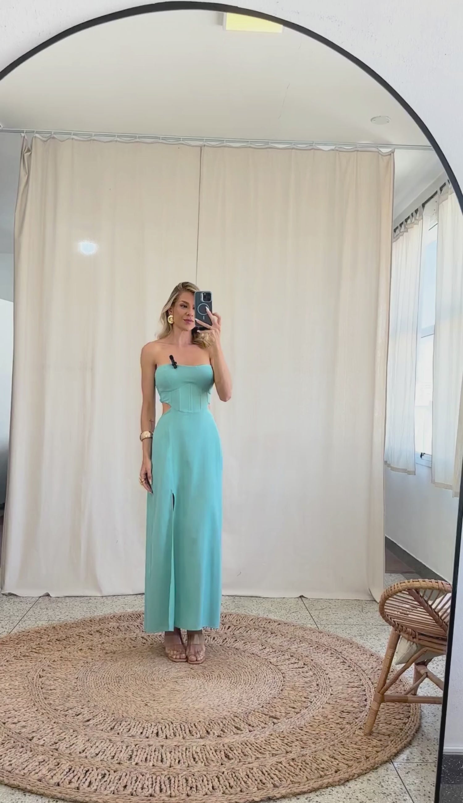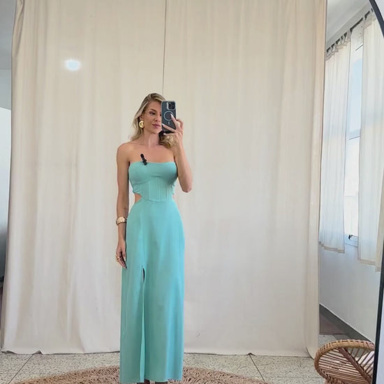 Vestido longuete, ajustado e sem mangas; confeccionado em linho misto texturizado com forro. Possui decote coração com silicone interno para melhor sustentação, recortes que modelam o busto, fenda na saia e pala larga na cintura com barbatanas que estruturam a peça, onde mantém o busto fixo à saia na frente, deixando toda a região da cintura à mostra. Nas costas do busto ainda conta com lastex franzido para melhor ajuste ao corpo e nas costas da saia, elástico e fechamento por zíper de metal com o delicado pingente com detalhe da conchinha da Laguna gravado no metal.