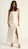 Vestido longuete, ajustado e sem mangas; confeccionado em linho misto texturizado com forro. Possui decote coração com silicone interno para melhor sustentação, recortes que modelam o busto, fenda na saia e pala larga na cintura com barbatanas que estruturam a peça, onde mantém o busto fixo à saia na frente, deixando toda a região da cintura à mostra. Nas costas do busto ainda conta com lastex franzido para melhor ajuste ao corpo e nas costas da saia, elástico e fechamento por zíper de metal com o delicado pingente com detalhe da conchinha da Laguna gravado no metal.