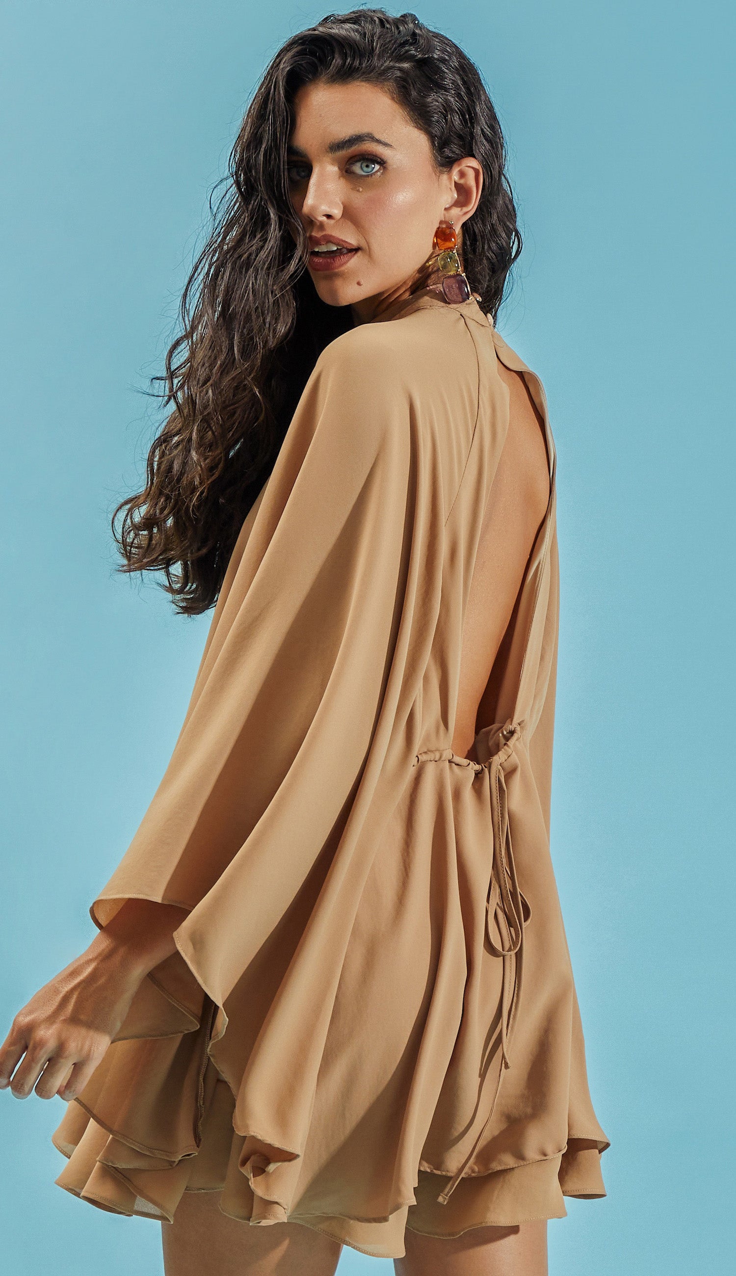 Vestido curto e amplo confeccionado em crepe leve de alfaiataria com forro. Possui gola alta com fechamento na nuca por botões esmaltados, e tecido solto a partir da gola, lembrando uma capa; decote aberto nas costas com ajuste da cintura por tirinha embutida para amarração atrás.