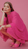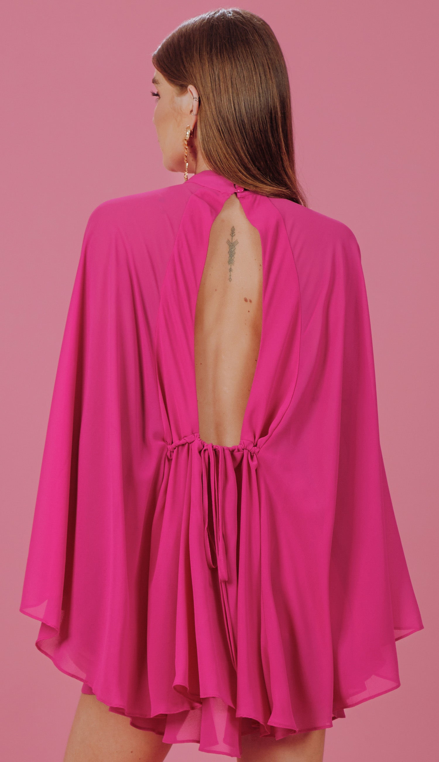 Vestido curto e amplo confeccionado em crepe leve de alfaiataria com forro. Possui gola alta com fechamento na nuca por botões esmaltados, e tecido solto a partir da gola, lembrando uma capa; decote aberto nas costas com ajuste da cintura por tirinha embutida para amarração atrás.