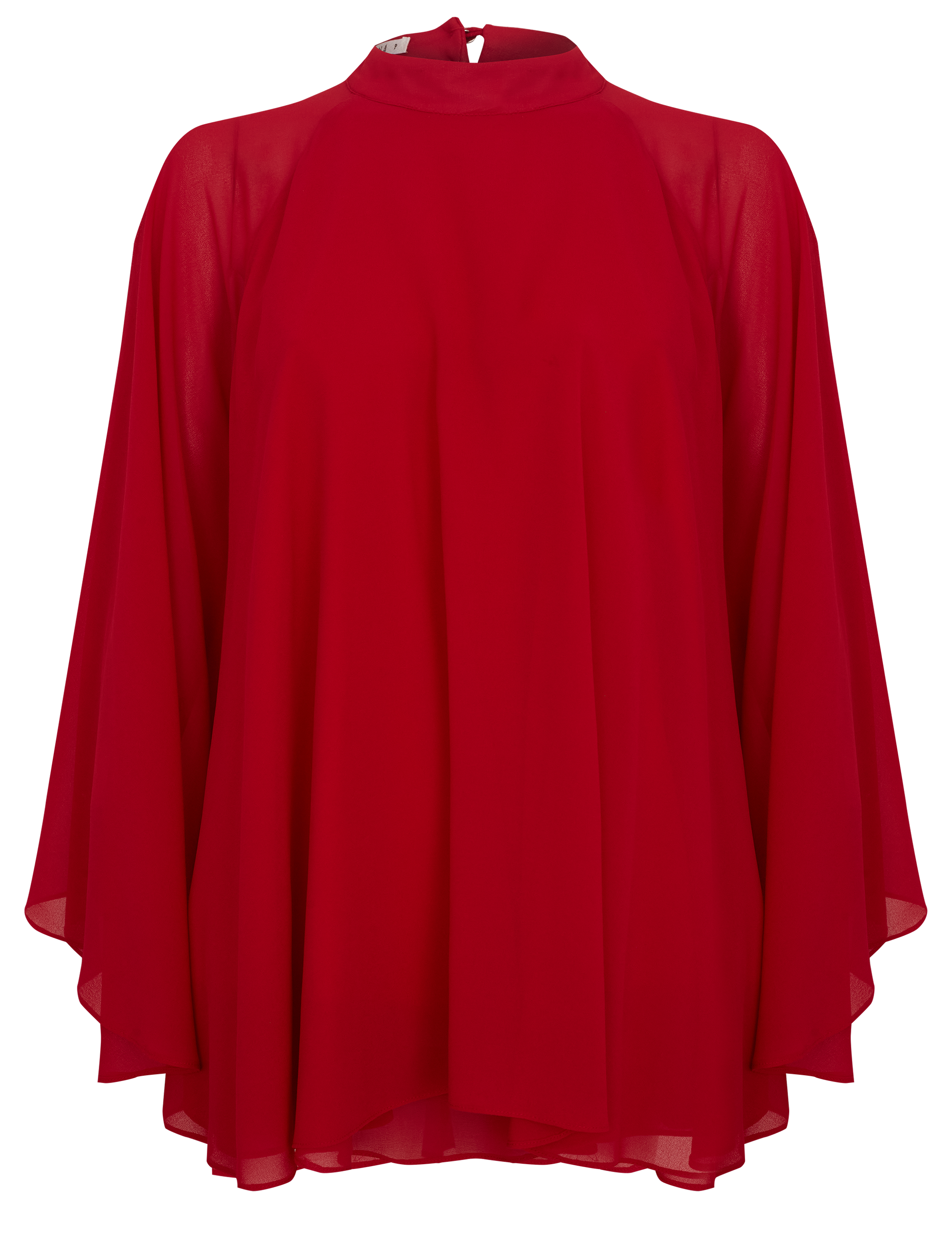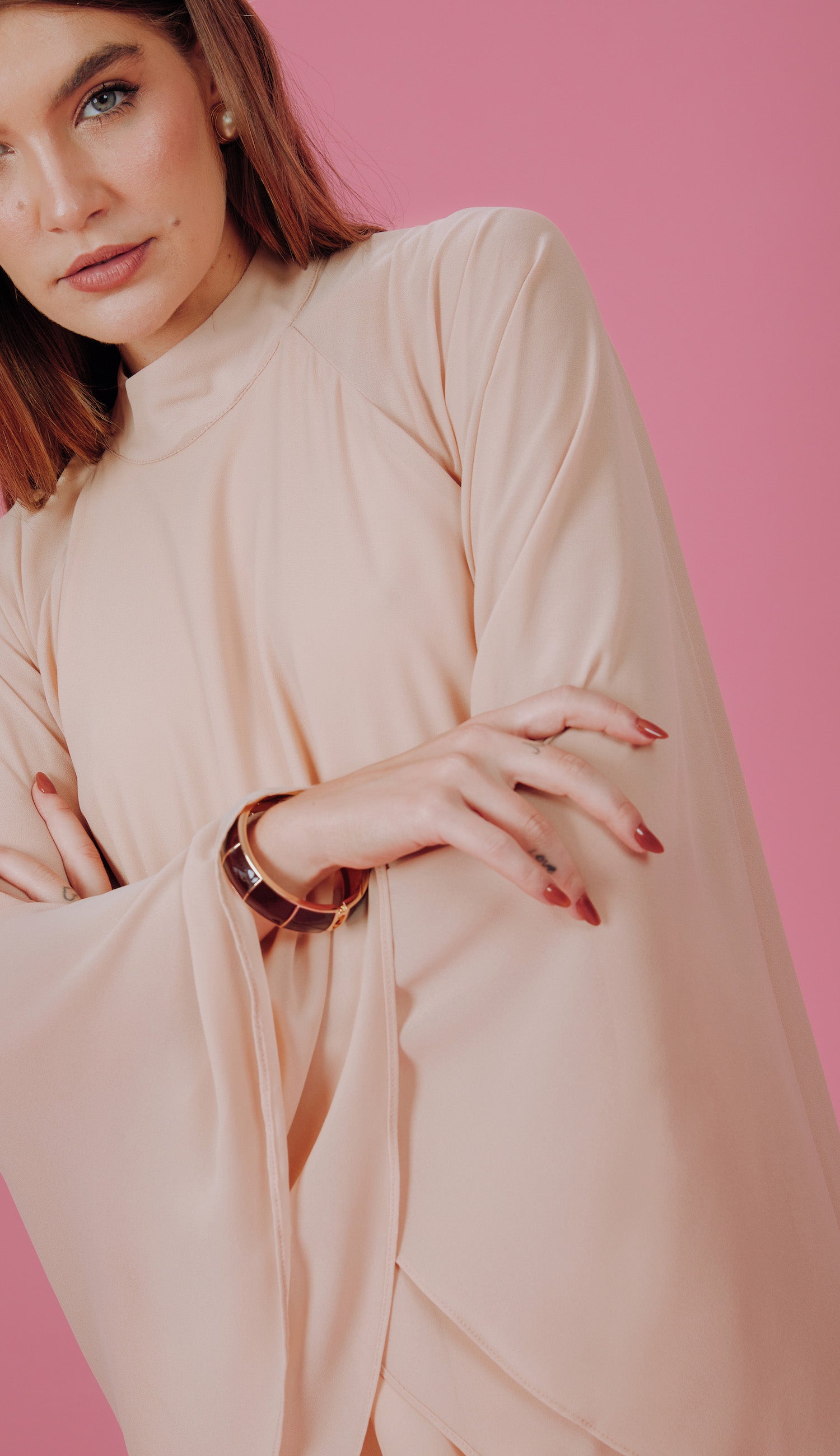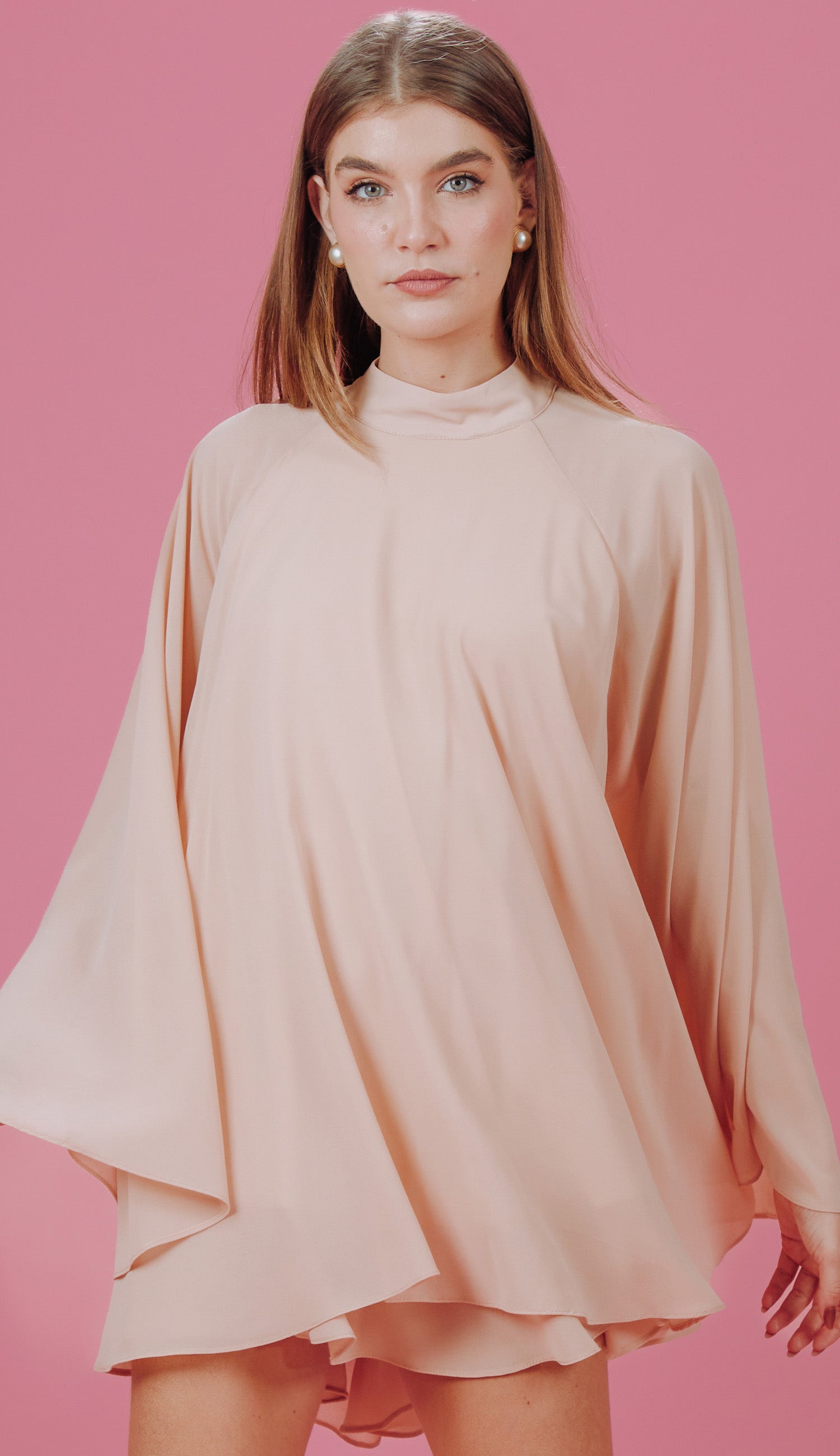 Vestido curto e amplo confeccionado em crepe leve de alfaiataria com forro. Possui gola alta com fechamento na nuca por botões esmaltados, e tecido solto a partir da gola, lembrando uma capa; decote aberto nas costas com ajuste da cintura por tirinha embutida para amarração atrás.