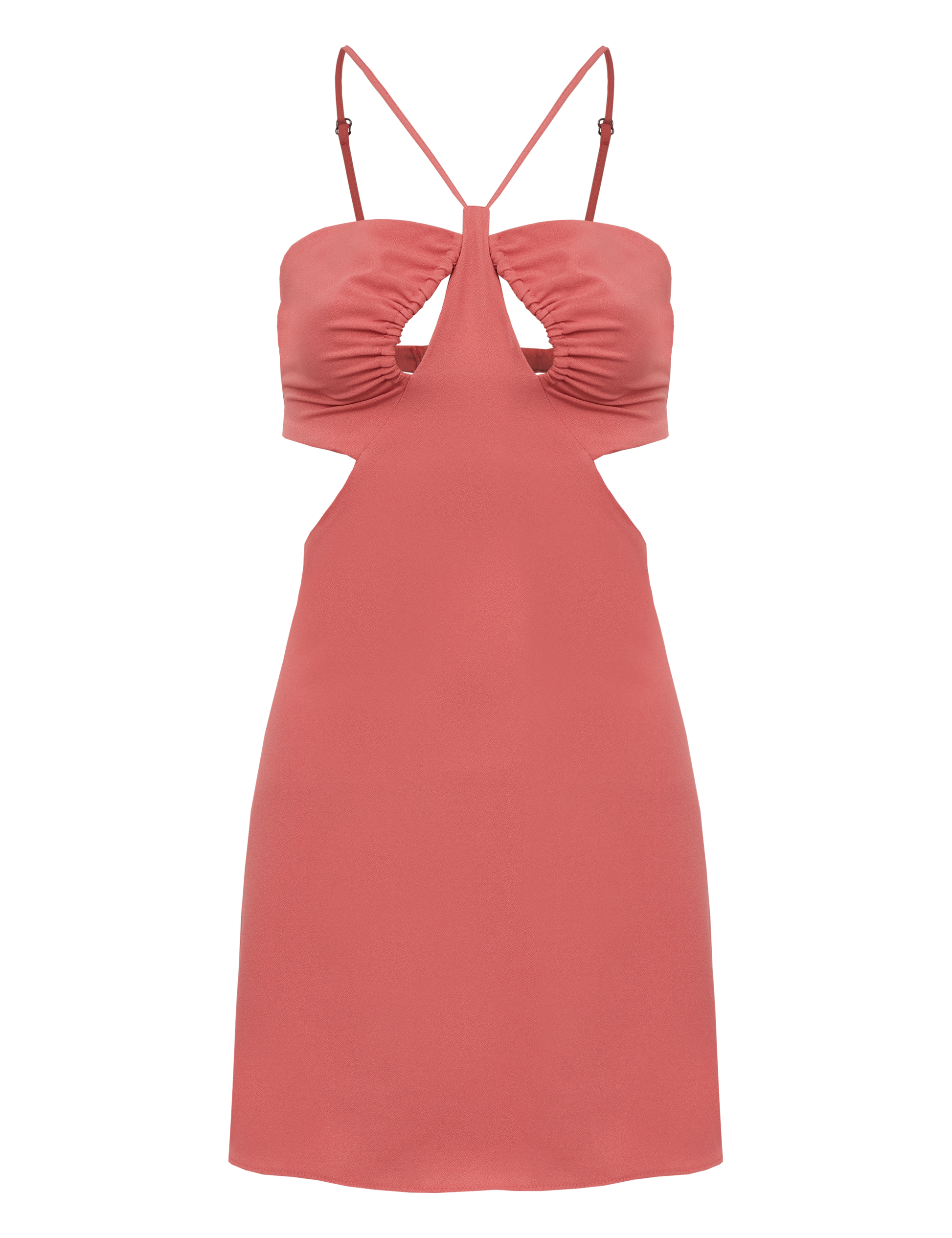Vestido curto confeccionado em crepe de alfaiataria com forro. Possui modelagem ajustada; busto fixo á saia somente por recorte frontal, deixando toda a região da cintura à mostra; decote assimétrico com recortes, vazados e franzidos no centro do busto; alcinhas reguláveis que também saem do centro do busto, indo até as costas; fechamento traseiro por fecho de encaixe de metal com elástico para melhor ajuste ao corpo e elástico fino também na parte traseira da saia.