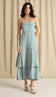 Vestido longuete sem mangas com forro, confeccionado em viscose com toque e aspecto de linho. Possui decote reto com pala dobrada sobreposta, silicone elástico interno para dar mais segurança, barbatanas no busto que estruturam a peça, fechamento traseiro por zíper de metal com o detalhe charmoso da conchinha da Laguna gravada, recortes que desenham a silhueta, sendo bem ajustado até a região do quadril, onde possui um recorte assimétrico e duas camadas de babados soltinhas sobrepostas logo abaixo.