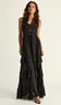Vestido longo confeccionado em crepe leve com forro curto. Possui decote princesa, alcinhas reguláveis, recortes que modelam a peça, detalhes de entremeio vazado no busto e na cintura, saia em A com camadas de babados franzidinhos estilo três Marias, fenda frontal, lastex nas laterais das costas para maior conforto e fechamento traseiro por zíper invisível.
